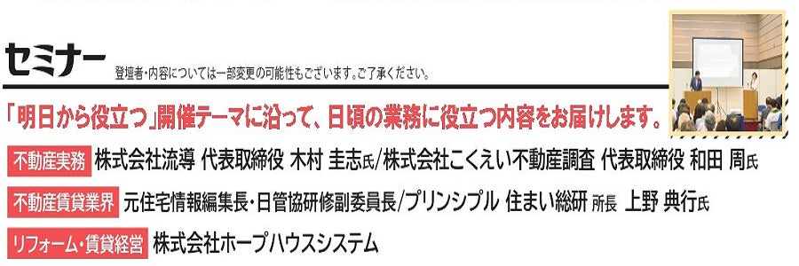 <出展業種>IT、通信、不動産情報サービス、住宅設備メンテナンス、リフォーム、家賃保証、専用商材販売、防犯コンサルタント、業界団体 等