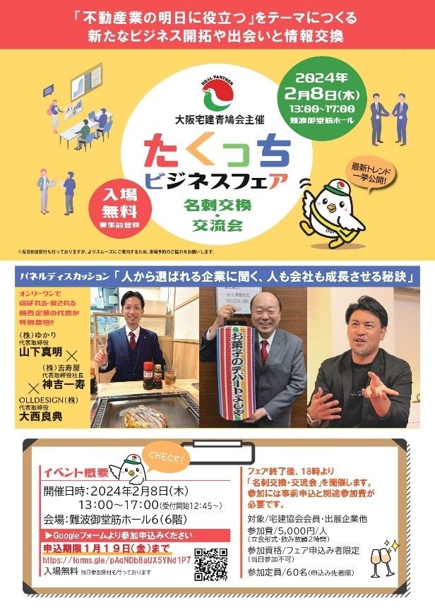 一般社団法人大阪府宅地建物取引業協会(所在地:大阪市中央区、会長 高村永振(以下、大阪宅建と言います。))は、2024年2月8日(木)に建築・建設・不動産業界の課題を解決する最新のビジネスアイデアが得られる専門イベント「たくっちビジネスフェア」を開催します。