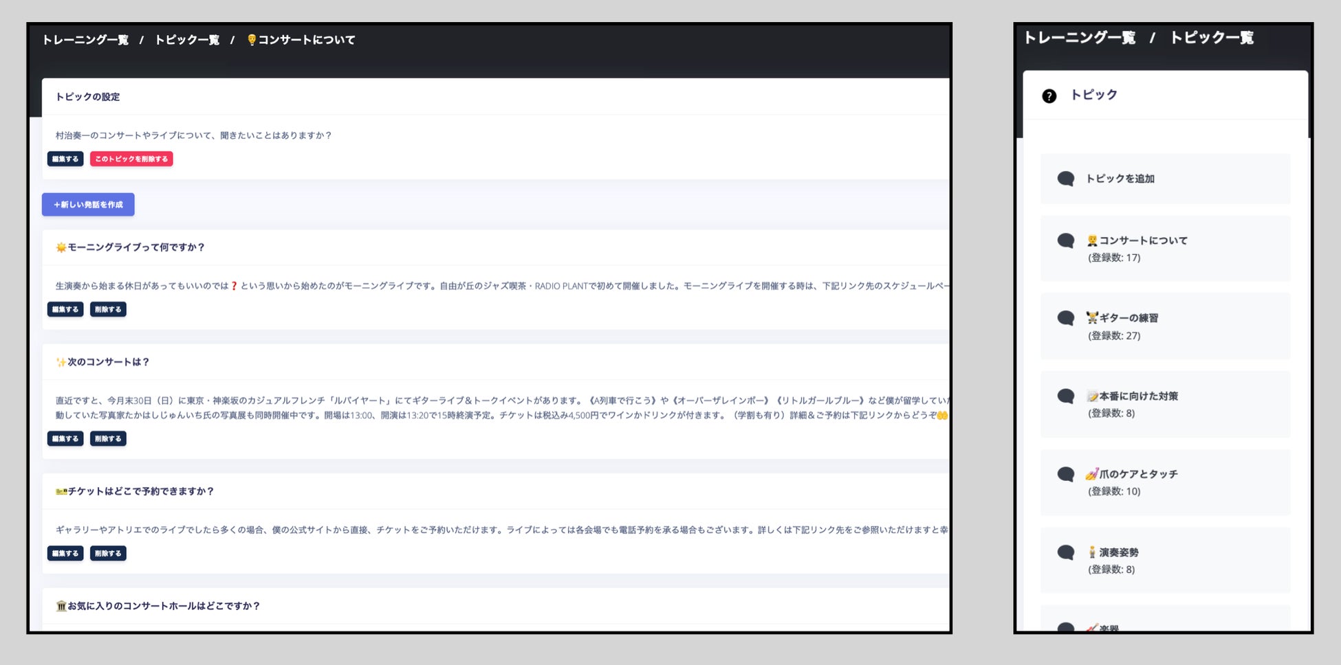村治氏は以前より、上記の想いをお持ちだったとのことです。この悩みを解決するべく、昨今急激に進化を遂げている「AI」に村治氏は着目しました。GPTを始めとした大規模言語モデル(LLM)を利用した会話型AIを構築できるサービス「miibo(ミーボ)」を活用し、ご自身の手で「AI村治奏一」を製作されました。