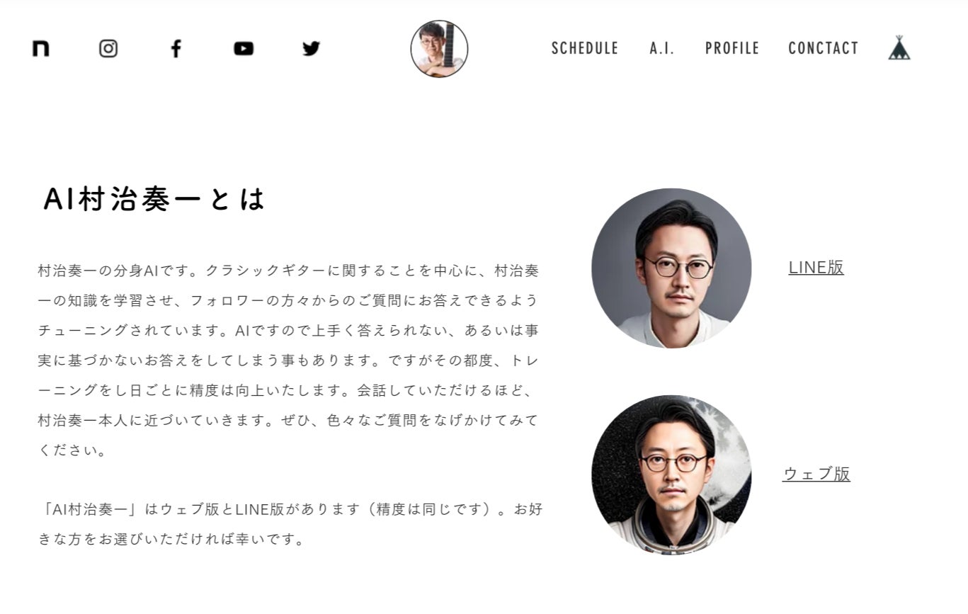 「AI村治奏一」は、クラシックギタリストとして活躍されている村治奏一氏を「会話ができるAI」にした、いわゆる「分身AI」です。村治氏の知識を学習したAIで、Web上またはLINE上で会話をすることができます。クラシックギターに関する質問や村治氏のコンサート情報、村治氏のプロフィールについて等、幅広い話題の会話が可能です。会話AI構築プラットフォームの「miibo( https://miibo.jp )」を利用し、村治氏ご本人が開発されました。