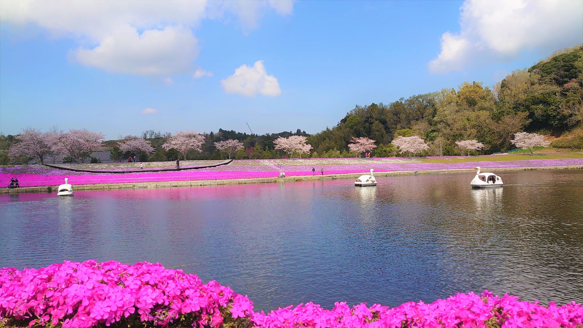 スワンボートからのお花見や、池の水面に映る逆さ芝桜の鑑賞もおすすめです。また、花びらの一つ一つがかわいらしく、遊歩道をお散歩しながら春を感じていただけることと思います。