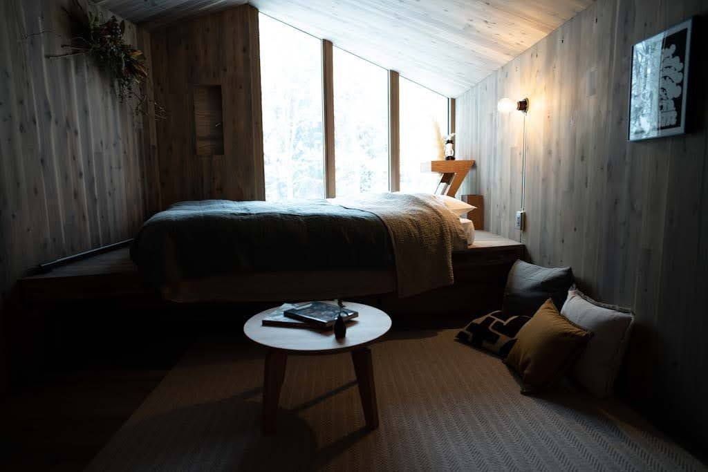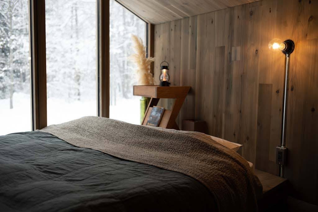 宿泊可能人数は最大3名。大きく開いた窓からは、美しく移ろう大自然の景観を堪能できる。24平米のコンパクトな空間に、クイーンサイズのベッド、基本的な調理器具を揃えたキッチン、清潔感のあるシャワールームとトイレを完備している。