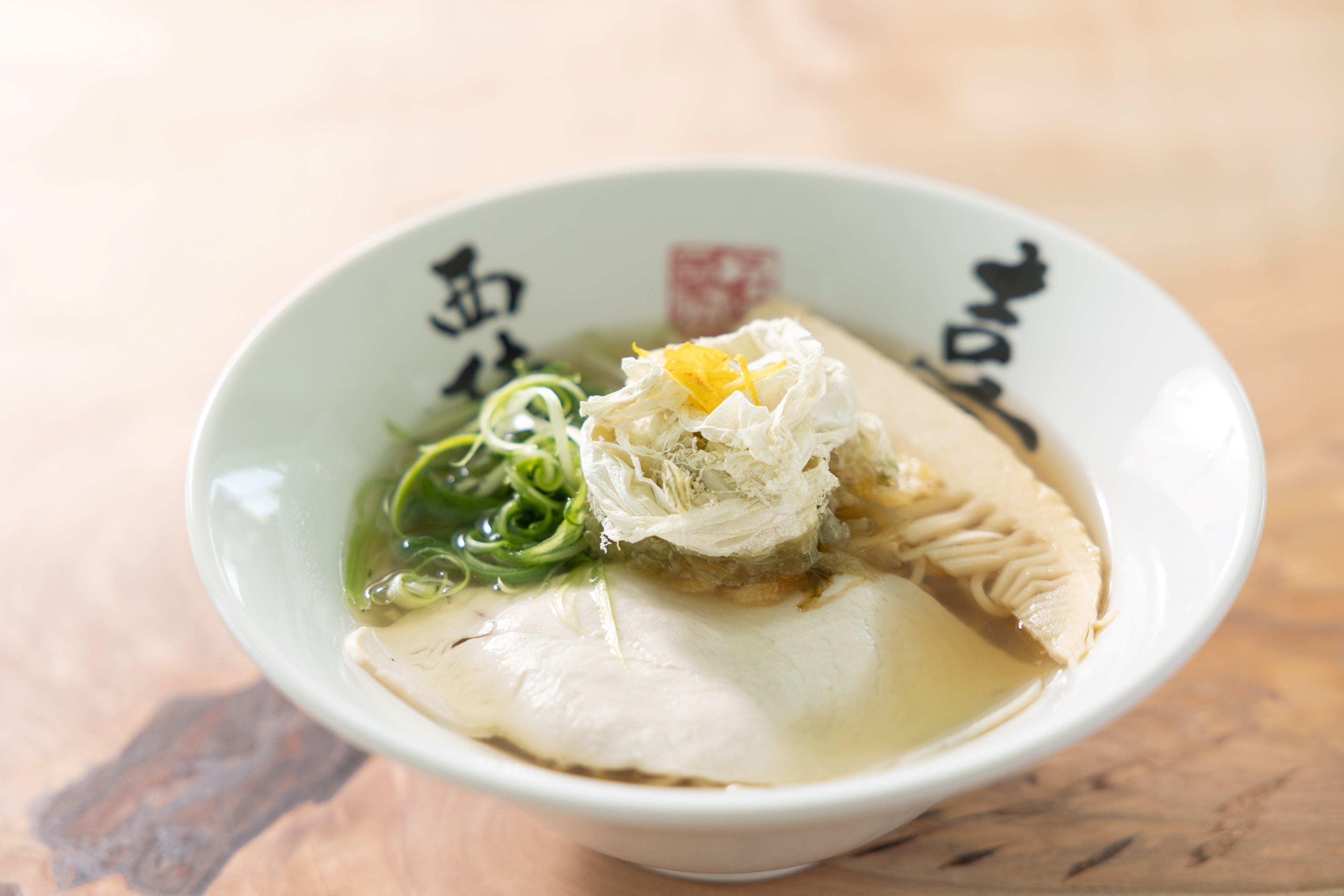 麺は、らぁ麺とうひちの自家製麺。北海道産1等粉「春よ恋」を主体にした全粒粉麺でそばとラーメンの間のような味わい。チャーシューは朝引き国産若鳥胸肉をだし塩につけ低温調理で仕上げ、竹の子はだしで軽く炊き込み薄味をつけており、油をいれないかわりに、お揚げを軽くあぶっていれることによりコクをだしております。