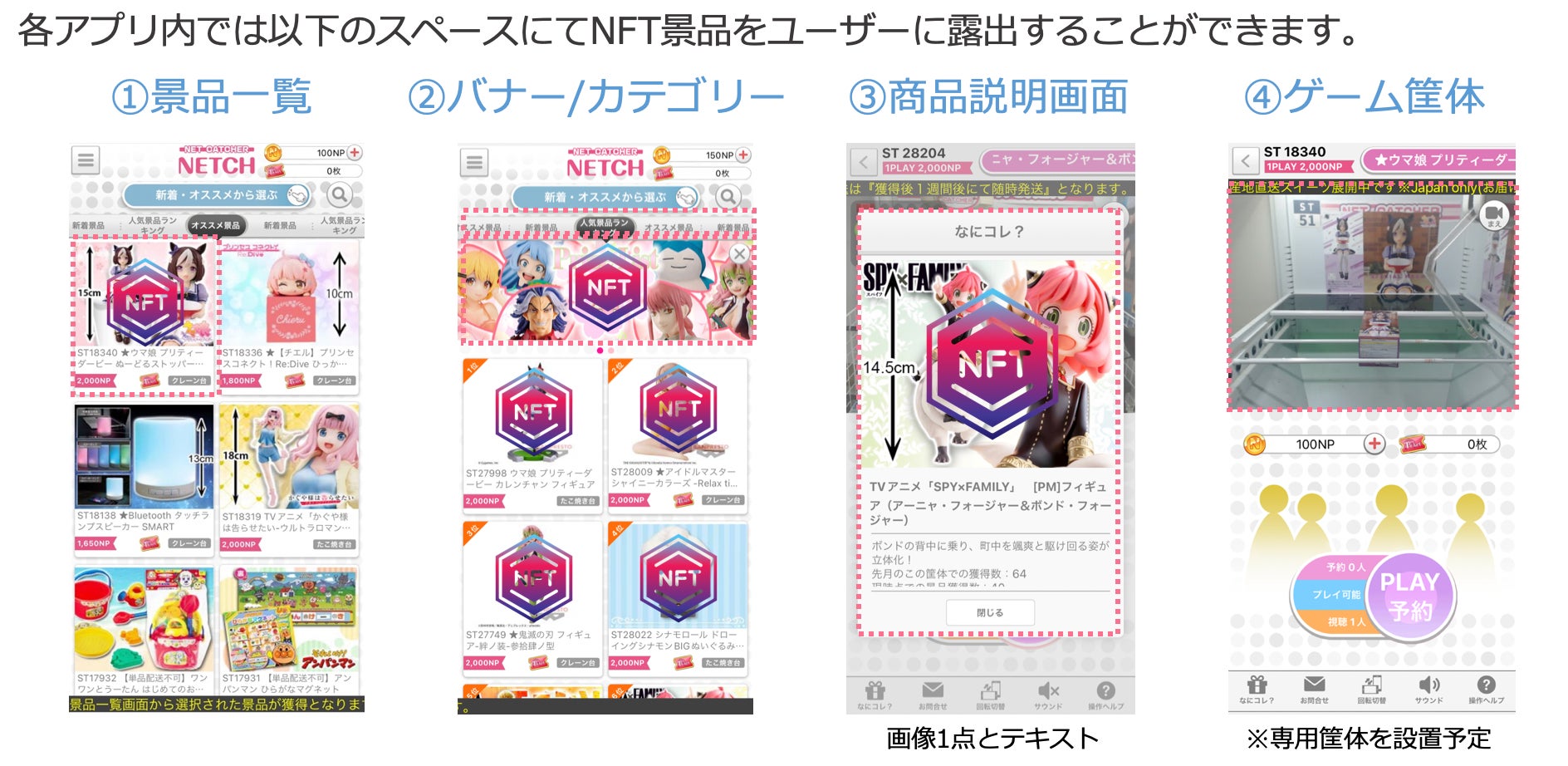 今回サービスを提供する「ネッチ」では、すでに人気のアニメグッズの他にも、ファミリーが好む食品や日用雑貨、コスメなど約4,000種類の景品が用意されていますが、さらに、NFT景品の取り扱いを開始します。