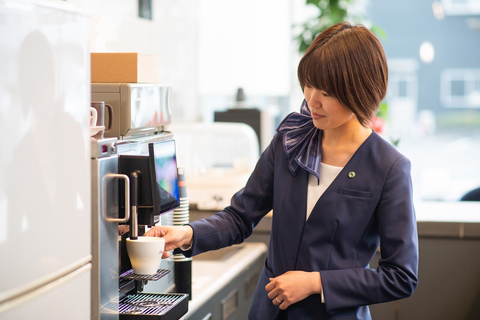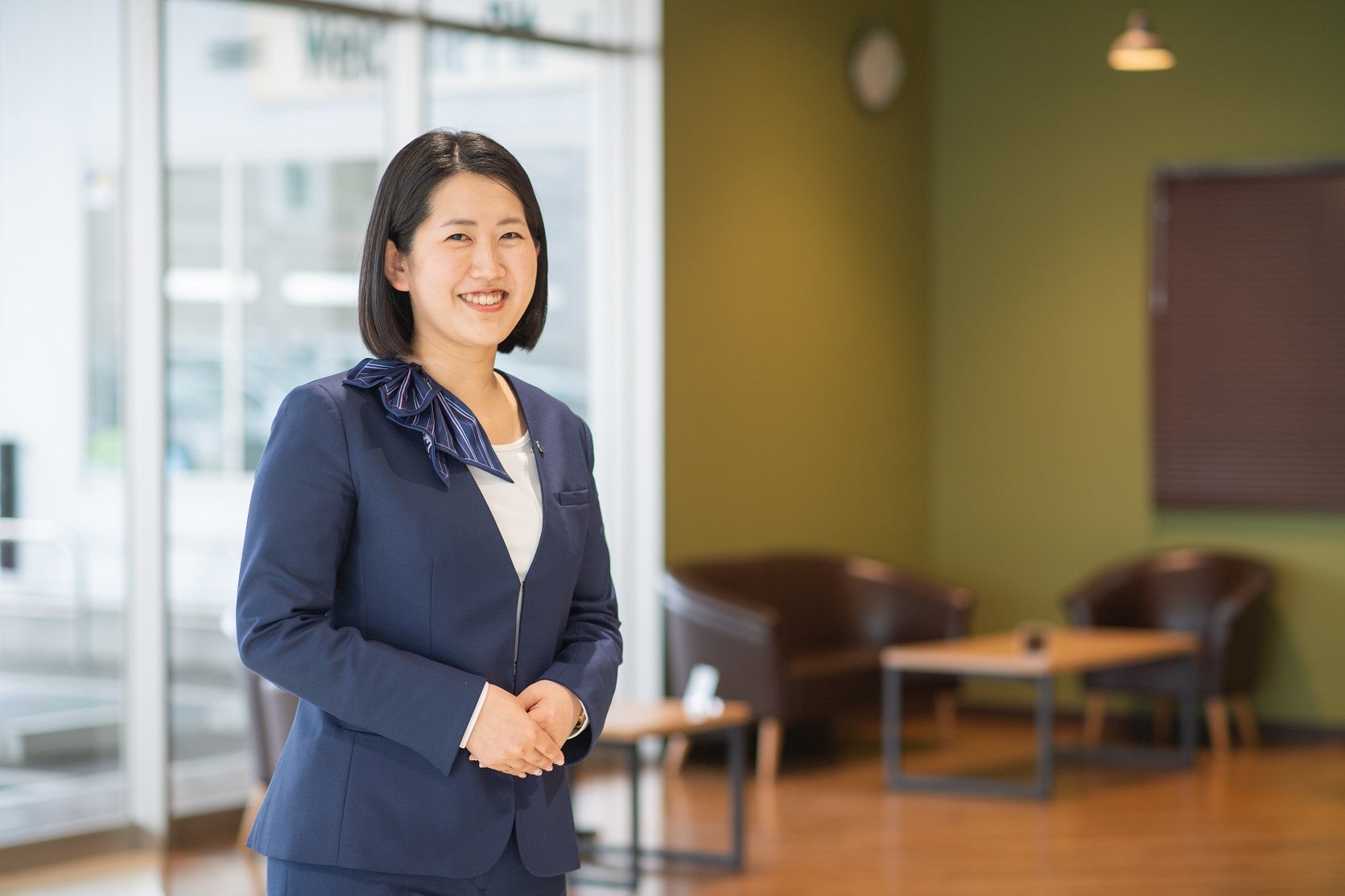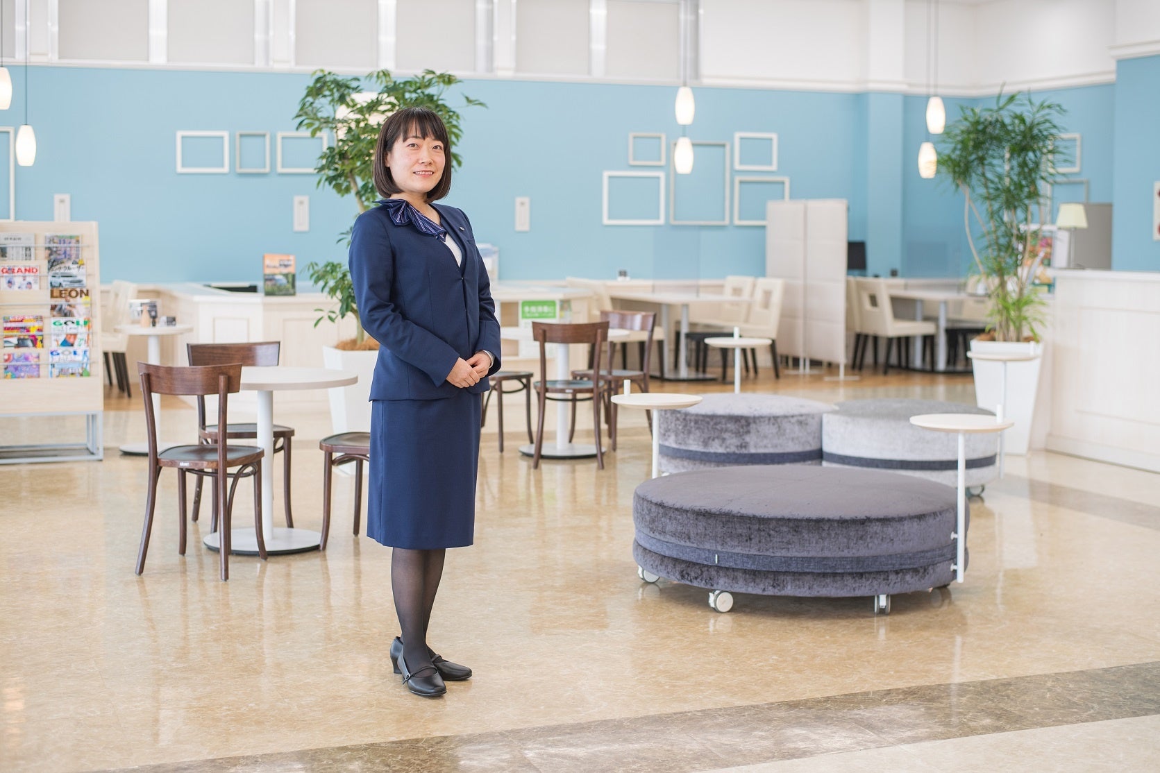 『美しく上質なデザイン』をコンセプトに、夏・冬の制服それぞれにおもてなしのテーマを表現しました。夏服は、ストレスフリーのおもてなしを表し、シンプルかつ高級感を演出するデザインです。茨城トヨペットでは、初のワンピーススタイルを採用しました。冬服は、おもてなしの精神を表現したモダンな装いで、洗練さを極めたデザイン。立ち居振る舞いをより美しく際立たせるスタイルです。季節に合わせた光彩のブルー効果もあり、肌も明るく映え、ウエストラインも引き締まった印象です。合わせているプルオーバーとのバランスも良く、首元もすっきり美しいユニフォームです。