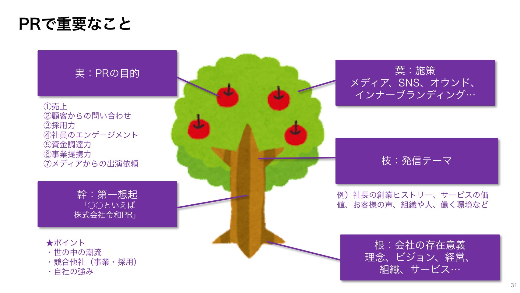 枝葉の施策ではなく会社の理念や存在意義となる根の部分、そして「〜といえば令和PR」のように世の中に想起される自社の強みである幹がPRにとって重要であることに触れ、それらを経営者としっかり時間をつくりヒアリングすることを解説しました。
