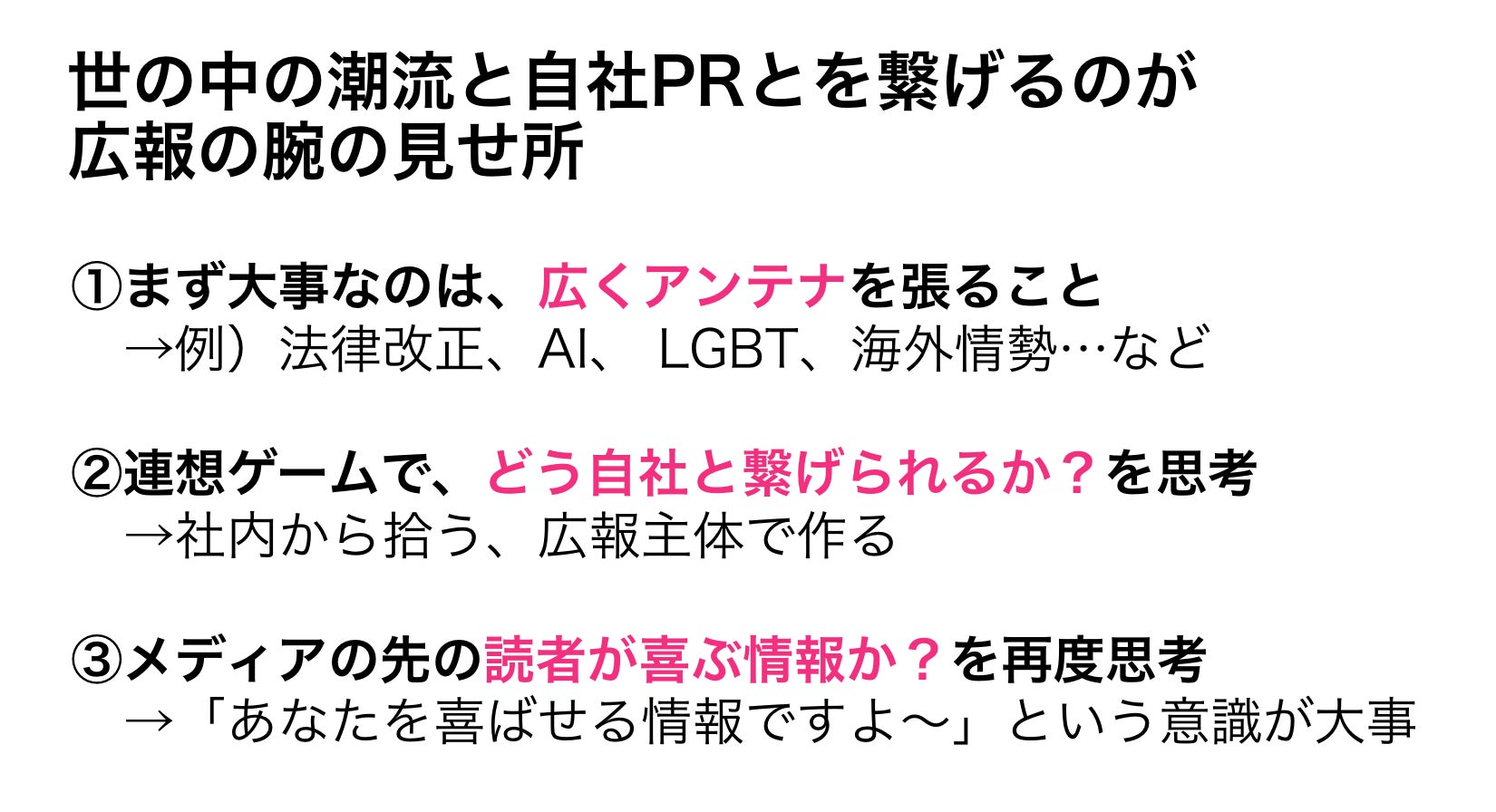 本日は充実のセミナーに参加させていただき、誠にありがとうございました!まずは世の中の潮流をしっかりとらえて、自社PRに繋げられるネタ・コンテンツ作りに励みたいです。 |