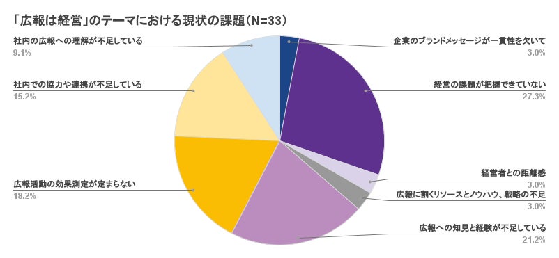 今回参加者は「経営視点で仕事ができるようになりたい」「目先の仕事に追われて中長期的に広報活動を考えられていないので考えるきっかけにしたい」「広報ノウハウの情報収集のため参加した」といった目的意識のもと参加をしたという意見が多くありました。しかし一方で「広報は経営」のテーマにおける現状の課題を聞いたところ、「経営の課題が把握できていない」が27.3%で最多、続いて「広報への知見と経験が不足している」が21.2%となりました。