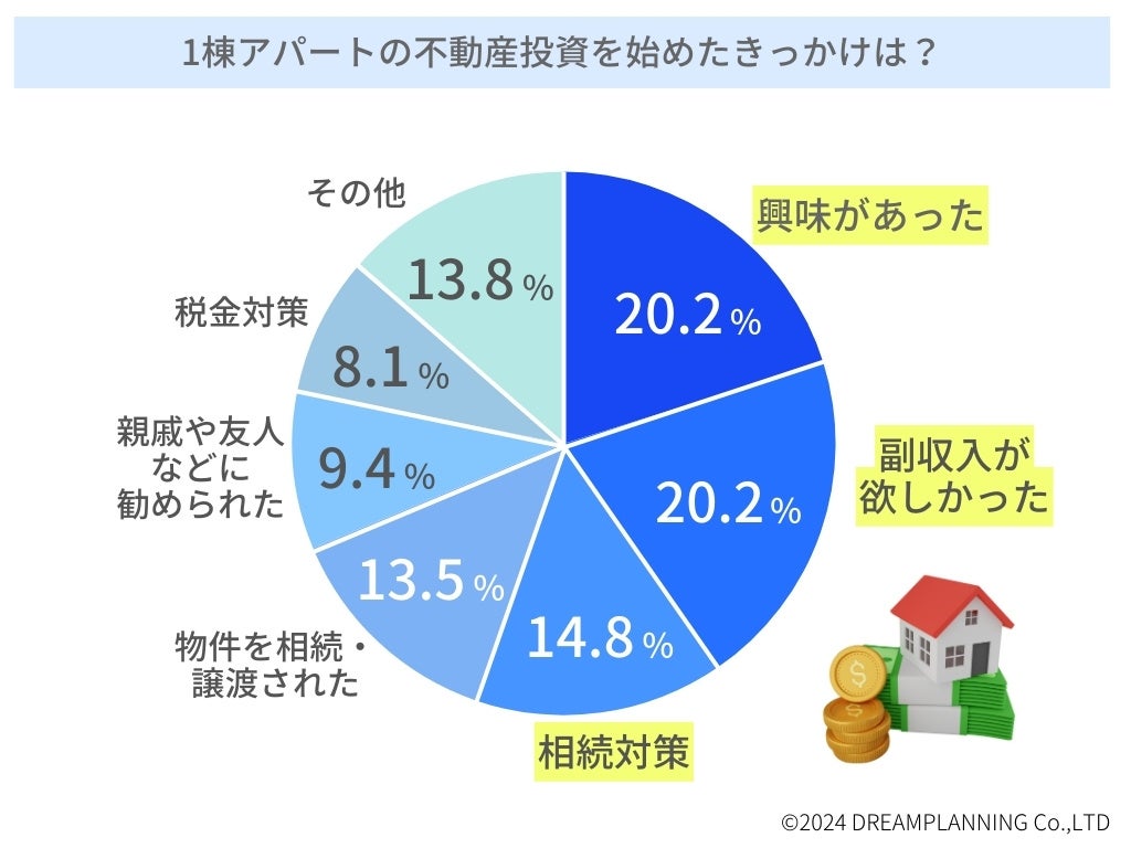 1棟アパート投資を始めるきっかけとして、最も多かったのは「副収入」と「不動産投資への興味」でした。