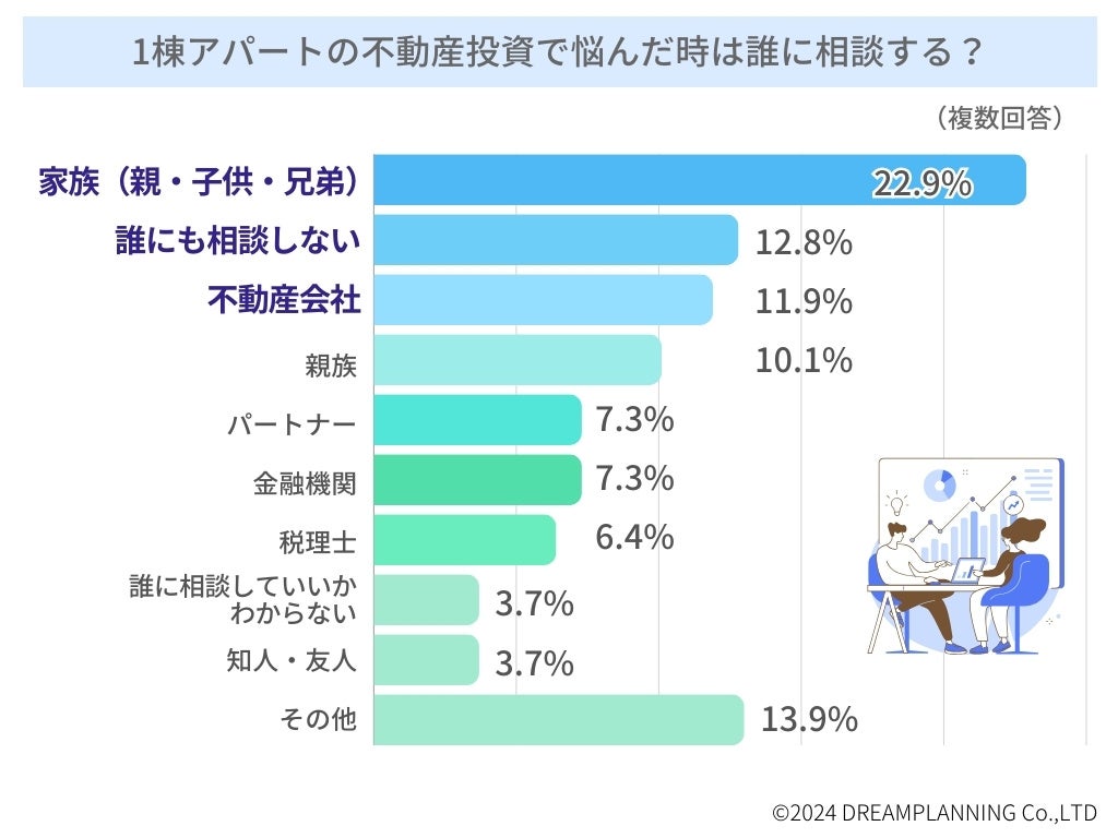 1棟アパートを経営していると、往々にして悩みは尽きません。そんな時は誰に相談するか調査したところ、最も多いのがやはり「家族」でした。