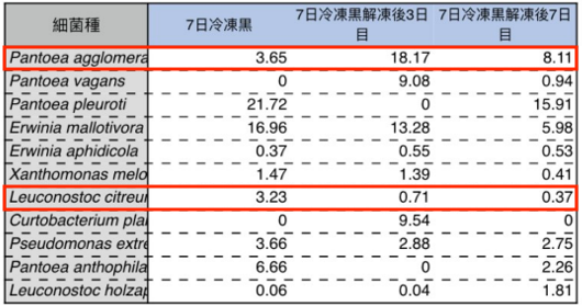 ■八恵堂キムチの菌の結果推移(冷凍時〜解凍後)