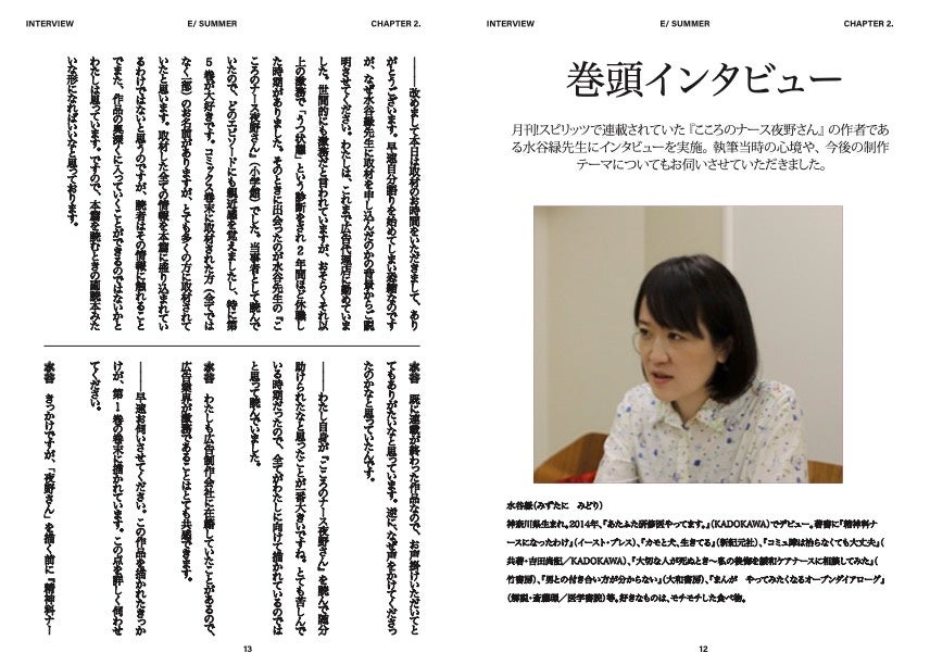 巻頭特集では、『こころのナース夜野さん』の作者である水谷緑先生へのインタビューを掲載しています。なぜ、精神科で働くナースを物語の主人公に据えたのか、執筆時のお考えや制作の過程で関わった多くの医療従事者や患者さんのお話などを伺いました。現在、『僕は春をひさぐ〜女風セラピストの日常〜』(講談社)をパルシィにて連載中の注目漫画家さんでもあります!