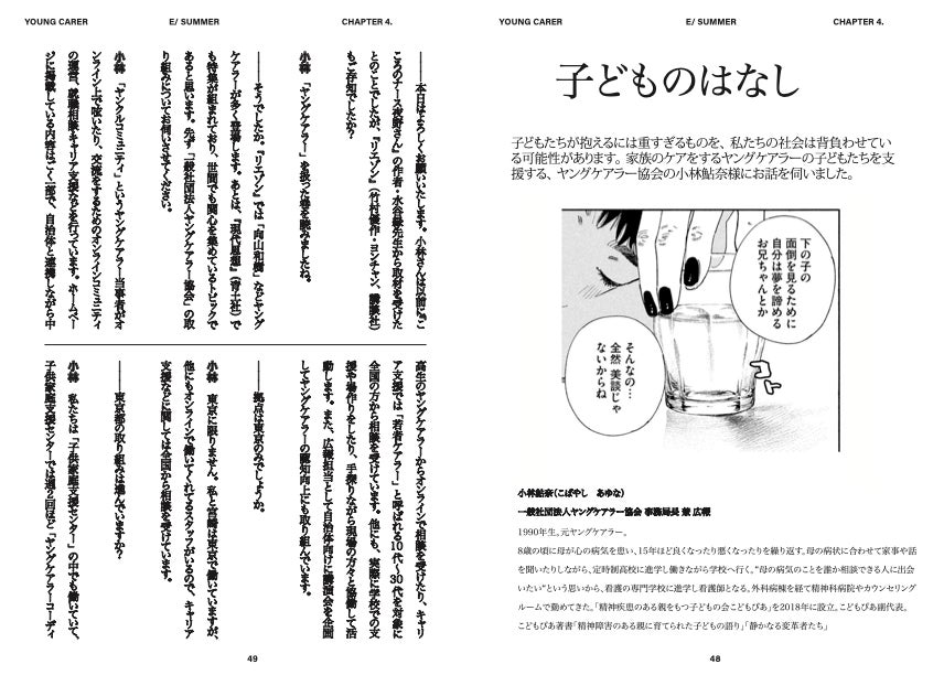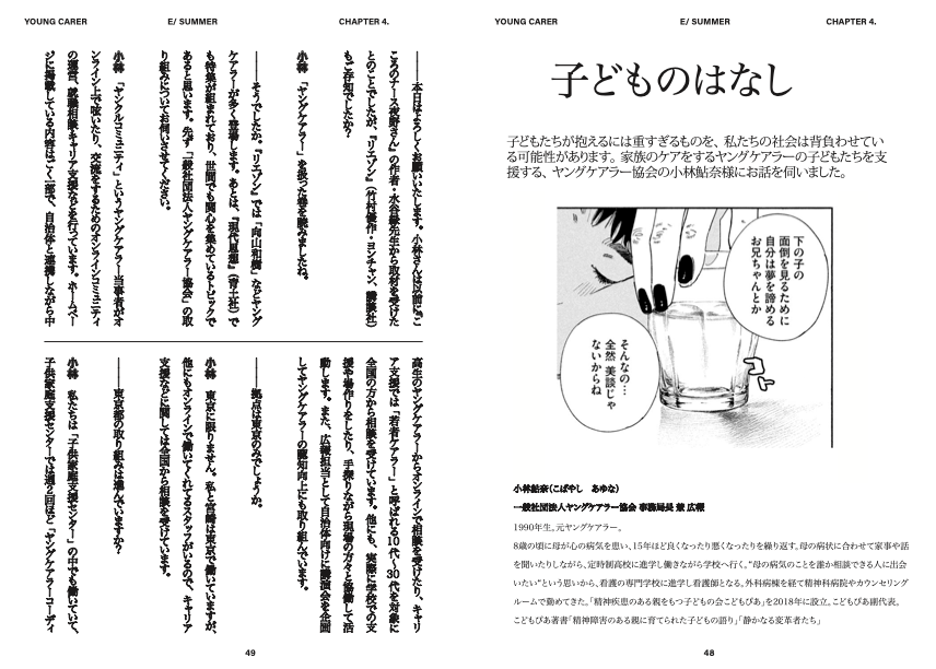 政府が異次元の子育て政策を掲げ、こども家庭庁が発足したのが2023年4月1日。これから、こども達自身の、そして子育てをする環境が改善方向に向かっていくと思いたいですが、『リエゾンーこどものこころ診療所ー』で取り上げられていた「ヤングケアラー」のテーマを深掘りするために、一般社団法人ヤングケアラー協会の小林鮎奈様に支援の実態についてお話を伺いました。