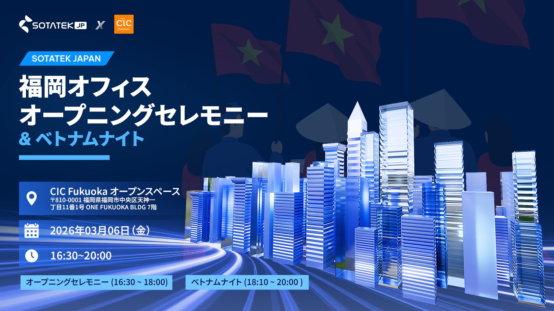 株式会社SotaTek Japan(以下、SotaTek Japan)は、福岡オフィスの開設を記念し、2026年3月6日(金)に「福岡オフィスオープニングセレモニーとベトナムナイト」を開催いたします。