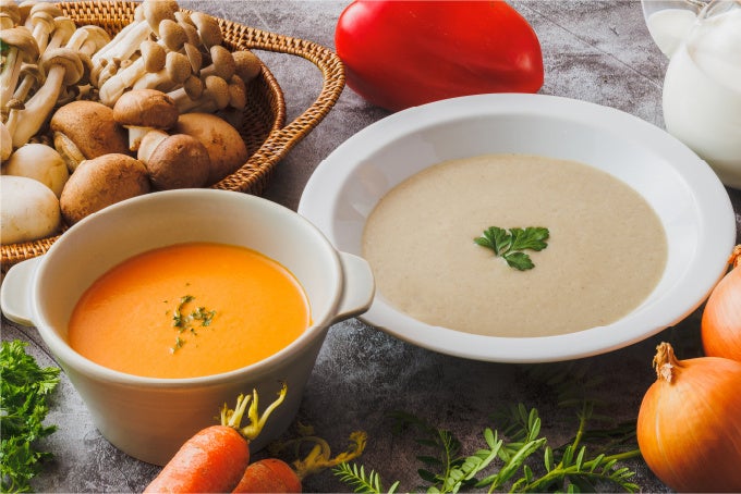 パプリカのポタージュとキノコのポタージュの詰め合わせです。気分に合わせてお好きなポタージュをお楽しみください。