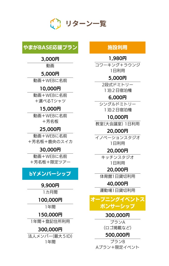 3,000円~30,000円までのリターンをご用意しています。金額に応じお礼動画の共有やWEBページへのお名前掲載、YAMAGA BASE施設芳名板へのお名前掲載などがございます。さらに、それに加えてオリジナルTシャツや、山鹿市名産のスイカや施設ツアーなどが付帯したものもございます。