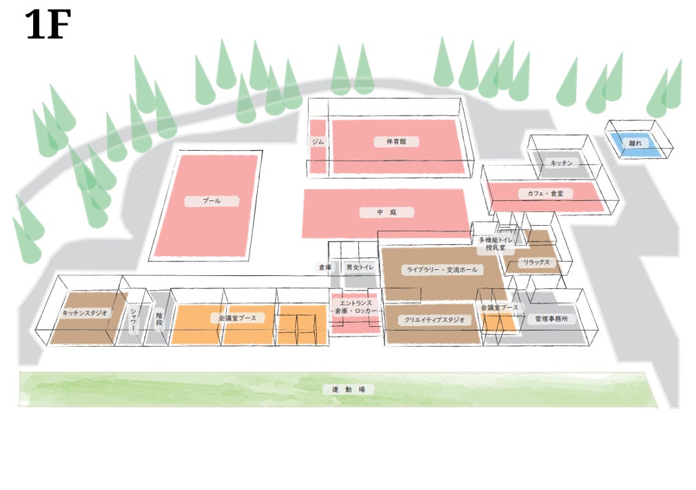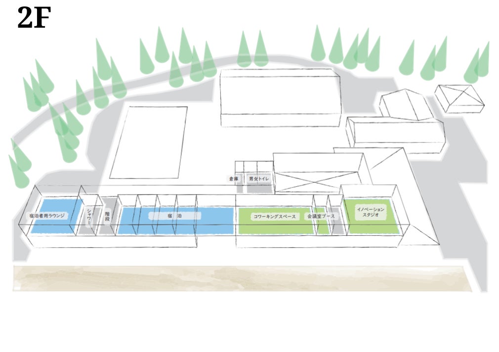 『YAMAGA BASE』は2階建てのメイン棟にコワーキングスペースや各種レンタルスペース、宿泊施設を有するほか、別棟として飲食スペースや体育館なども併設予定です。