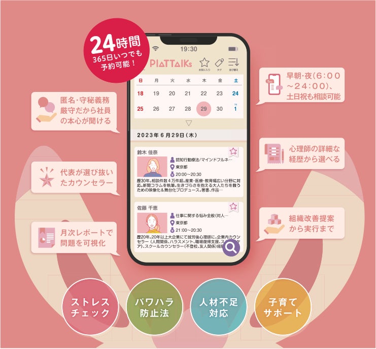 弊社は、契約法人の従業員が福利厚生として利用できる、匿名制の福利厚生オンライン心理相談サービス「Plattalks」を提供しています。企業における働き方・休み方の仕組みづくりを行う「社会保険労務士」と個人のメンタルヘルスに心理面から関わる「心理士」が共創・運営する日本唯一のサービスです。