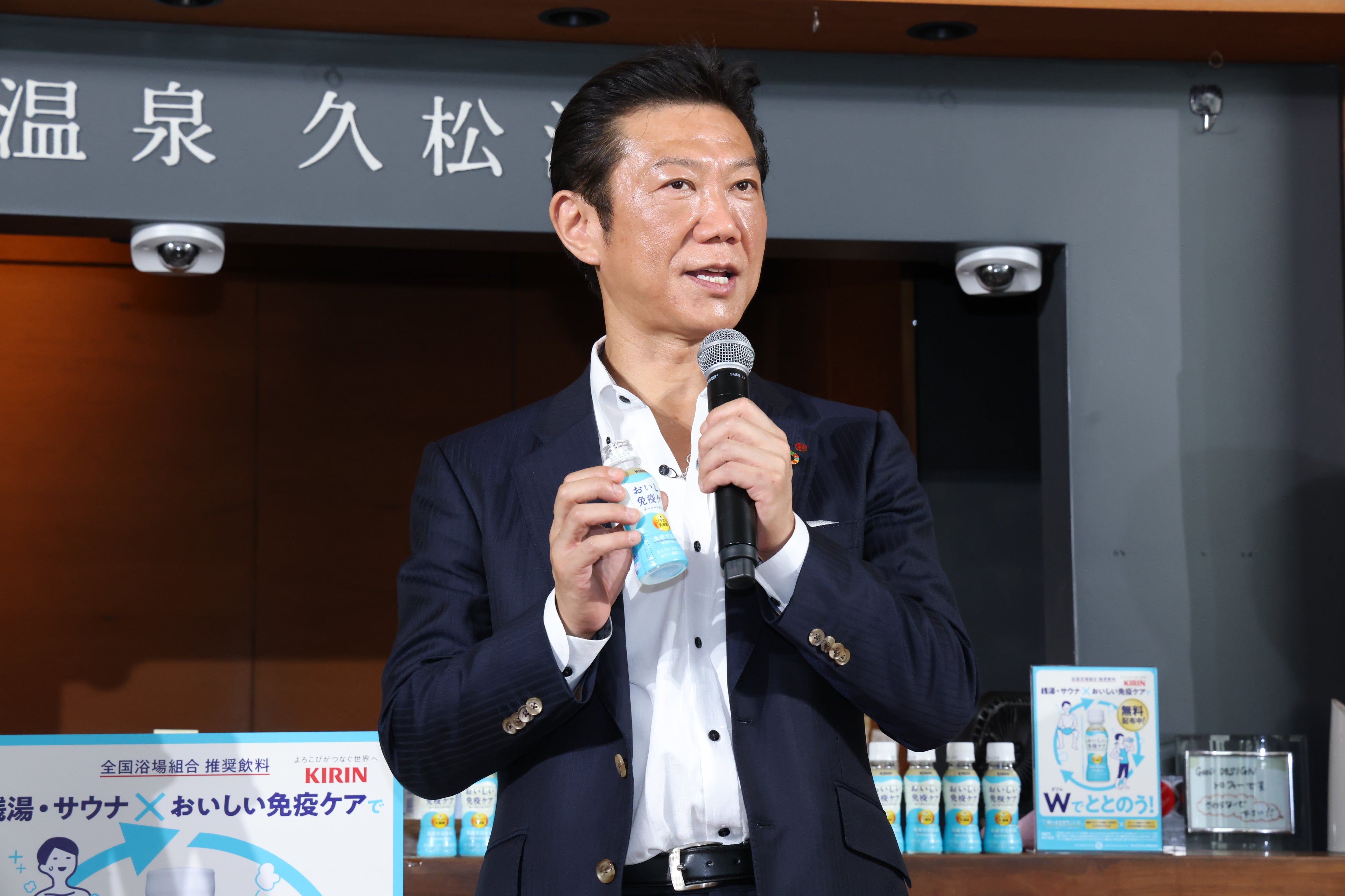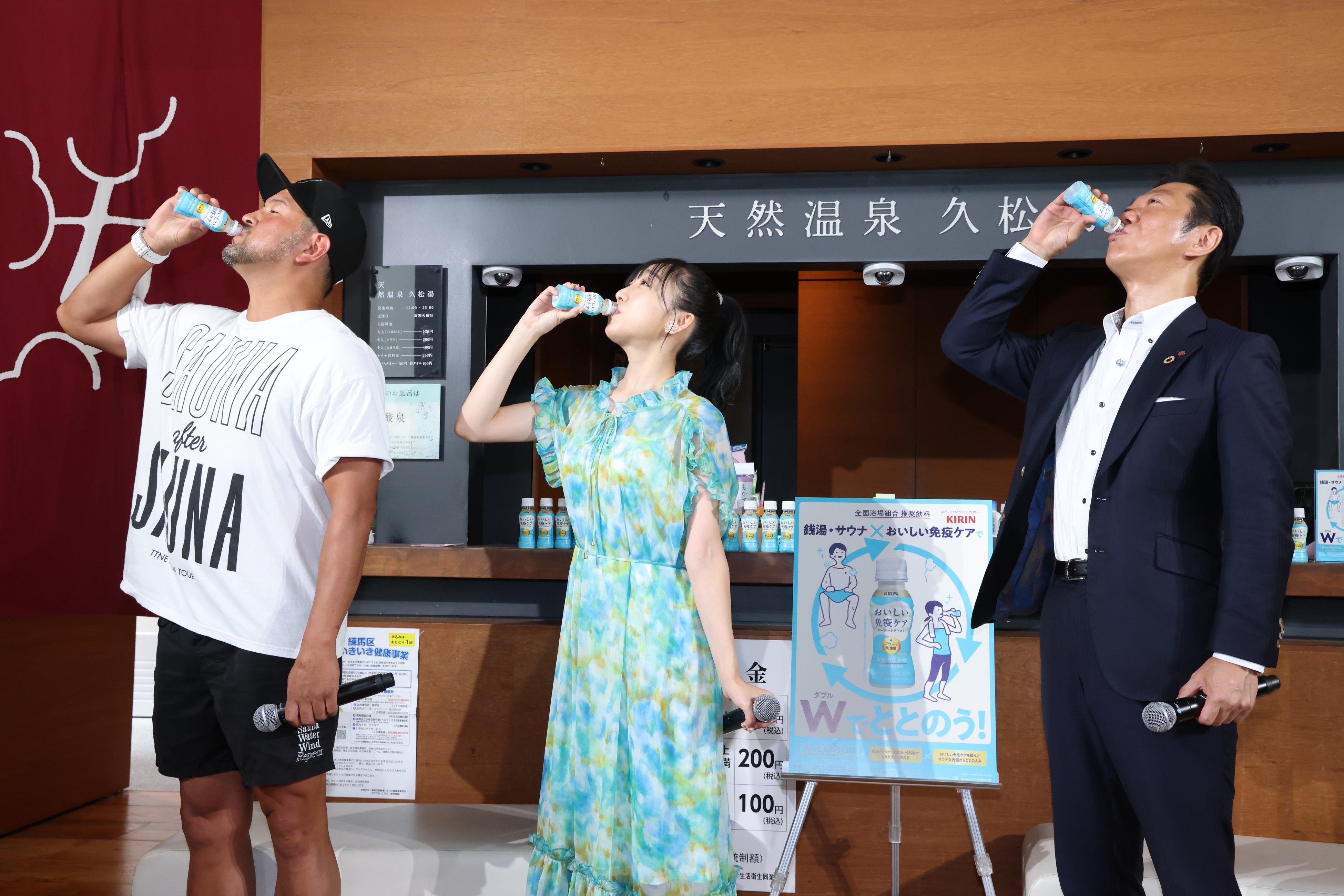 最後の「銭湯・サウナ×おいしい免疫ケアで”Wでととのう”」プロジェクトに関して、キリンビバレッジ株式会社 マーケティング部 ブランドマネージャー 山中進より本プロジェクト発足の経緯を説明。「免疫に関する意識は高まっていても、『免疫ケア』の行動をしている人は少ないというギャップがあることを背景に、心身ともに豊かに過ごす上で重要な『銭湯・サウナ』、その中でも昔から人々の健康を支えてきた全国浴場組合の皆様と一緒に、“Wでととのう”という新しい健康習慣を広げていきたい」とプロジェクトへの想いを語り、佐伯副理事長は「『銭湯・サウナ』を内側から健康になる施設として今後注目していただきたい。この取り組みが今後の入浴習慣として広まってもらいたい」と本プロジェクトへの期待や、リアルなお客様の声として「『おいしい免疫ケアを飲む機会をいただいて嬉しい』『毎日飲みやすい』などの声をいただいている」と紹介しました。また、サウナ師匠(秋山大輔さん)は「リセットされた後は体にいいものを取り入れたいと思うので、 “Wでととのう”はサウナーの間でも広がると思います」とコメントし、須田さんは「銭湯やサウナで汗を流してととのった後に、『おいしい免疫ケア』の染みわたるさわやかな甘さでおいしく『免疫ケア』して“Wでととのって”いただけると思います」とお話ししました。トークセッションの最後には、本プロジェクトで配布している「キリン おいしい免疫ケア」を3人で試飲。須田さんは「これを飲むのが楽しみなくらいスッキリした甘さがたまらないです」と試飲の感想を述べました。