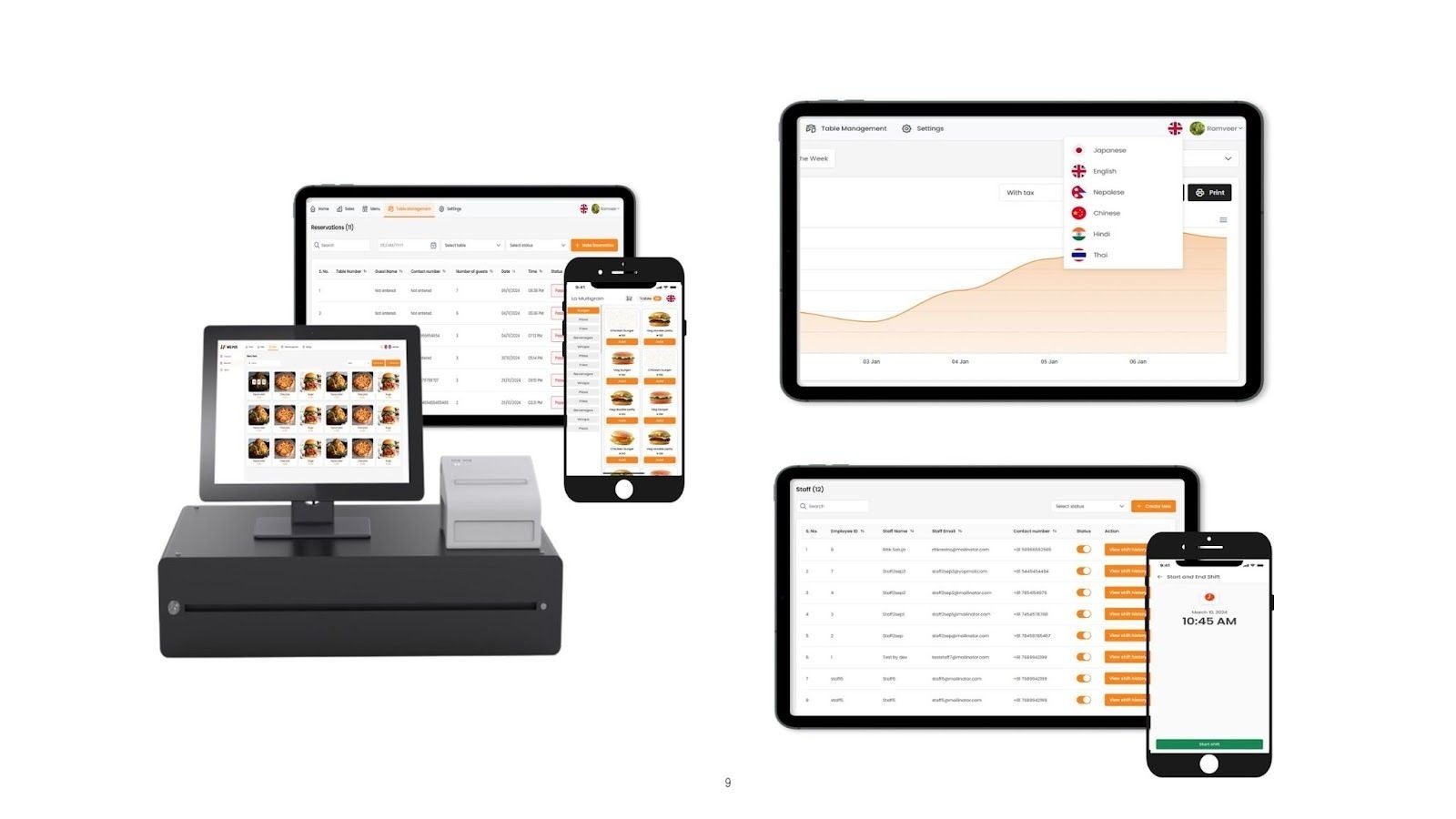 多言語対応:英語、ネパール語、ヒンディー語、タイ語、中国語、日本語など、複数の東南アジア圏の言語に対応しています。母国語での操作が可能なため、外国人スタッフも安心して使用できます。