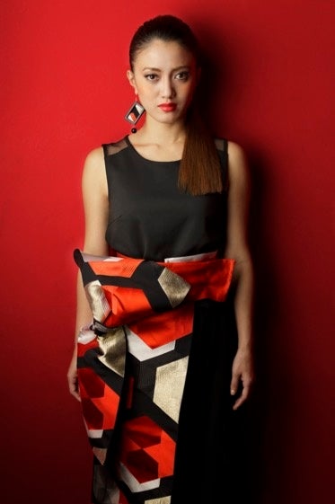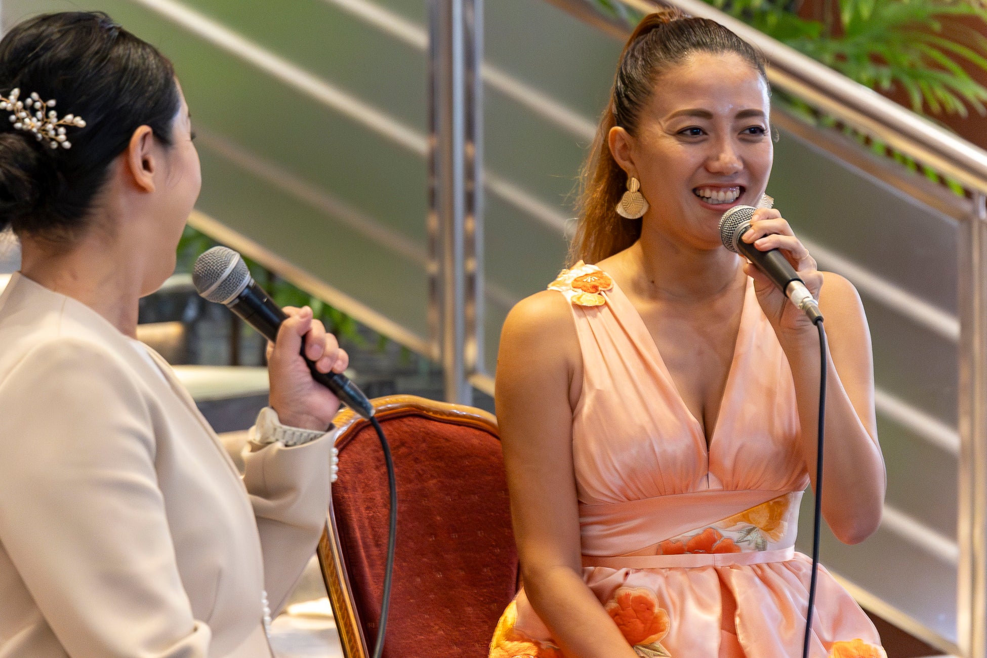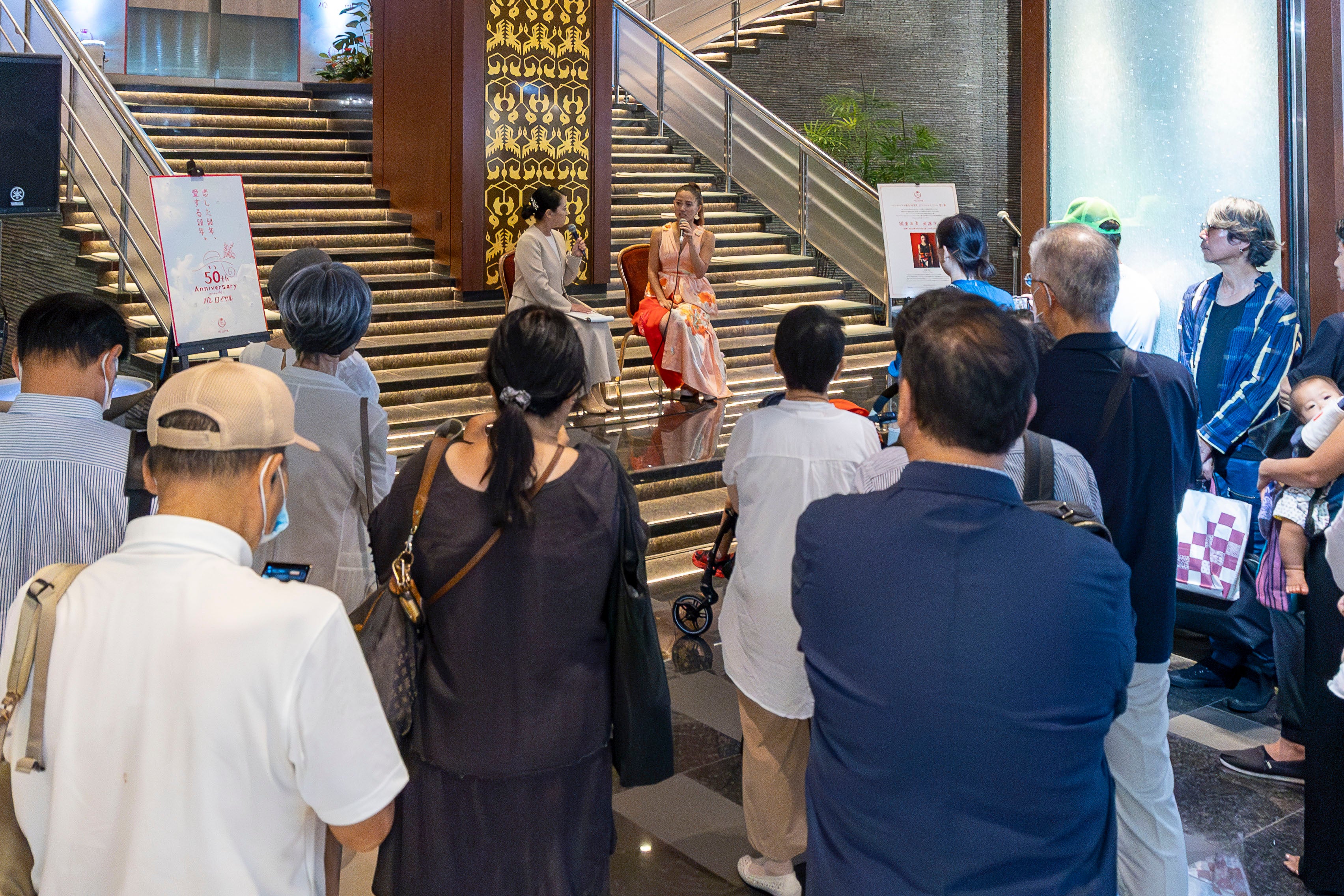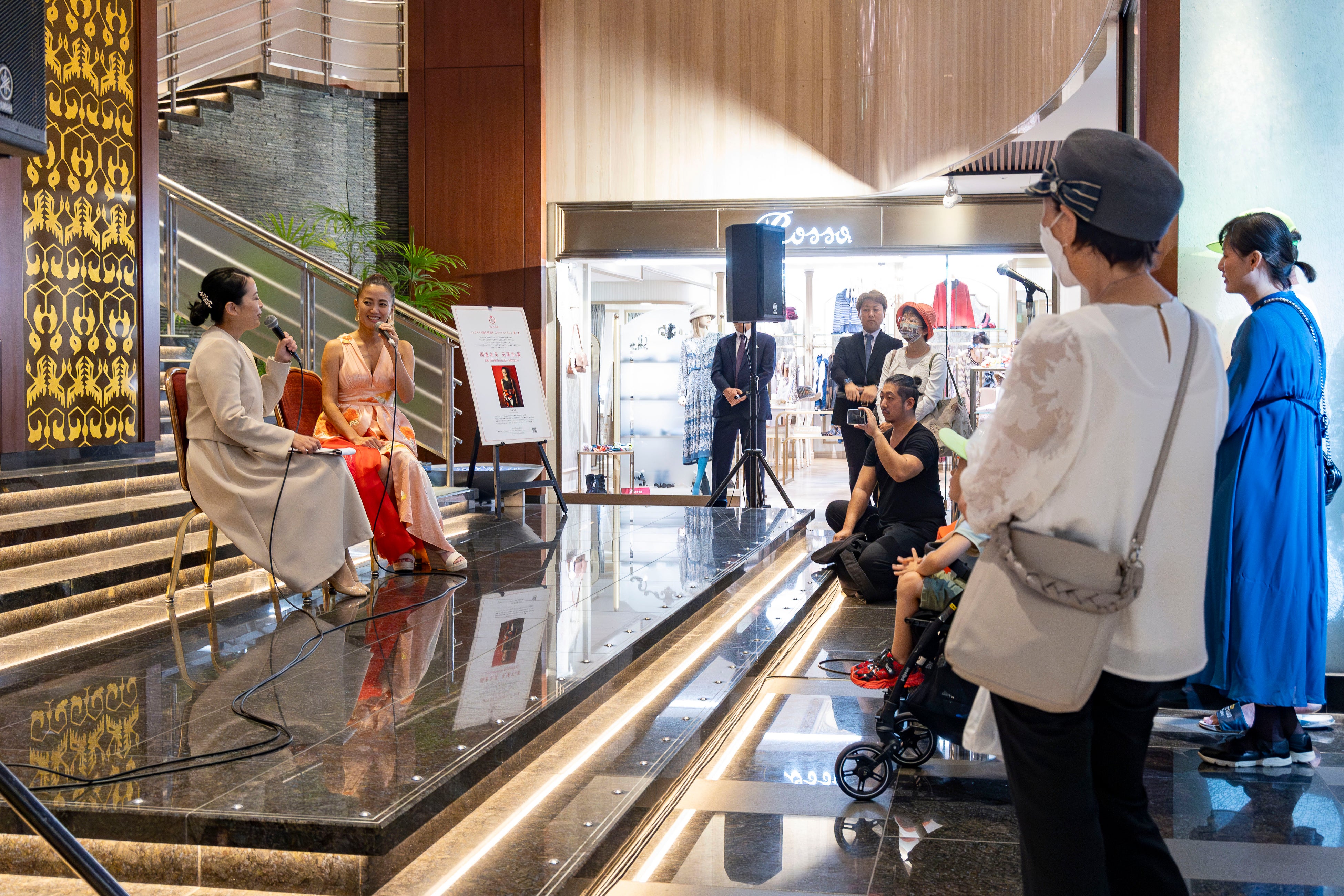 作品が展示されているパレロイヤル広場に設けられた特設ステージ前で、開始前から集まった100名近くの来場者が、展示作品を鑑賞しながら國重さんの登場を待つ中、午後一時すぎ、着物をアレンジした華やかな衣装で國重さんが登場。吹き抜けになったステージを覗き込むように、ホテルロビー階からもトークショーを楽しむ人々で溢れていた。