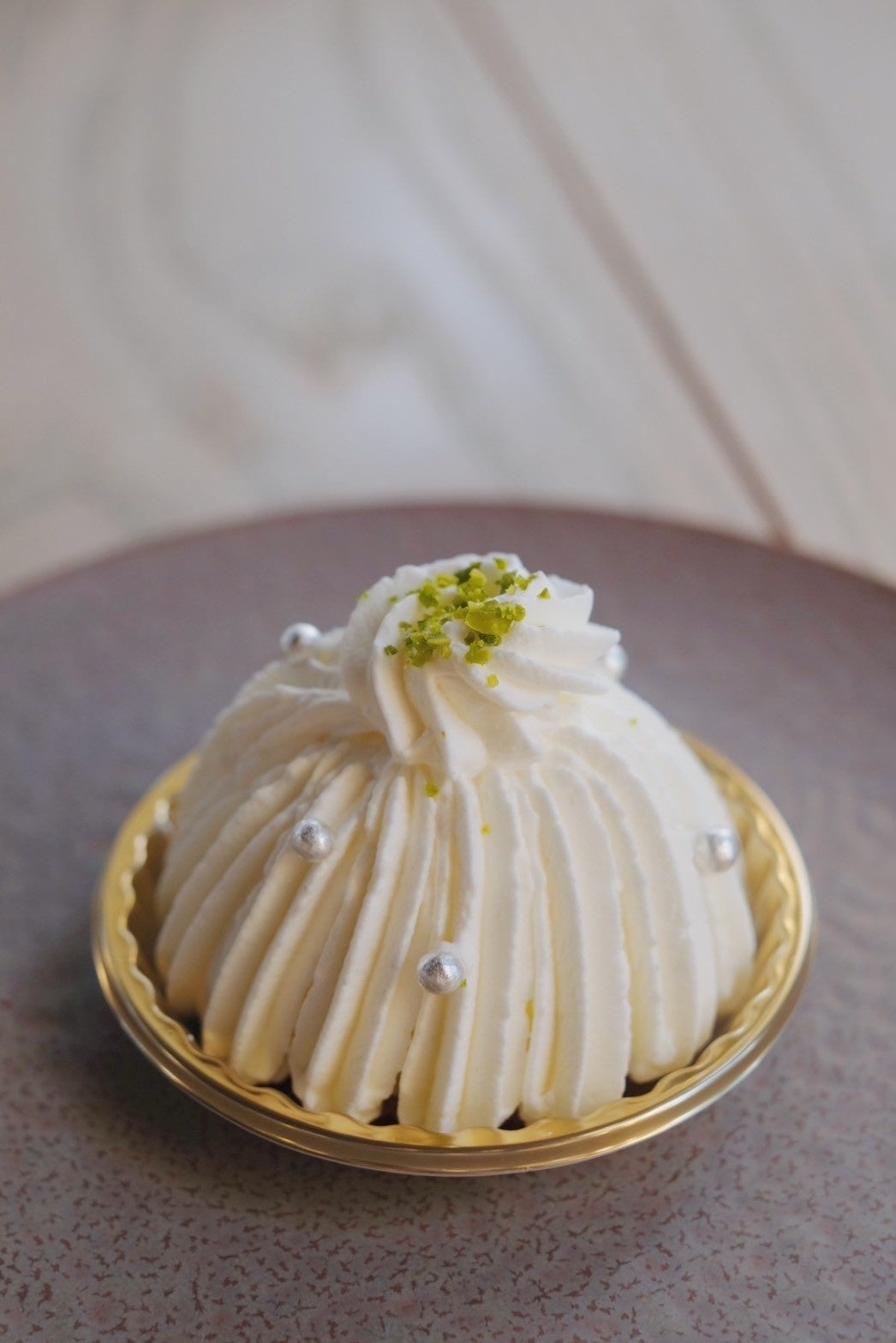 真っ白なクリームの中にピスタチオムースとベリーのジュレを閉じ込めました。周りの生クリームはバニラとチェリーのお酒で香り付けをし華やかな風味に。