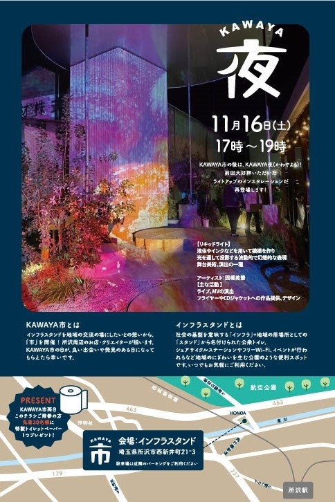前回大好評だった夜のイベント「KAWAYA夜」は、今回11月16日(土)17時~19時に開催。インフラスタンドが幻想的なアートに変わり、音楽が融合するライブパフォーマンスをお楽しみください。
