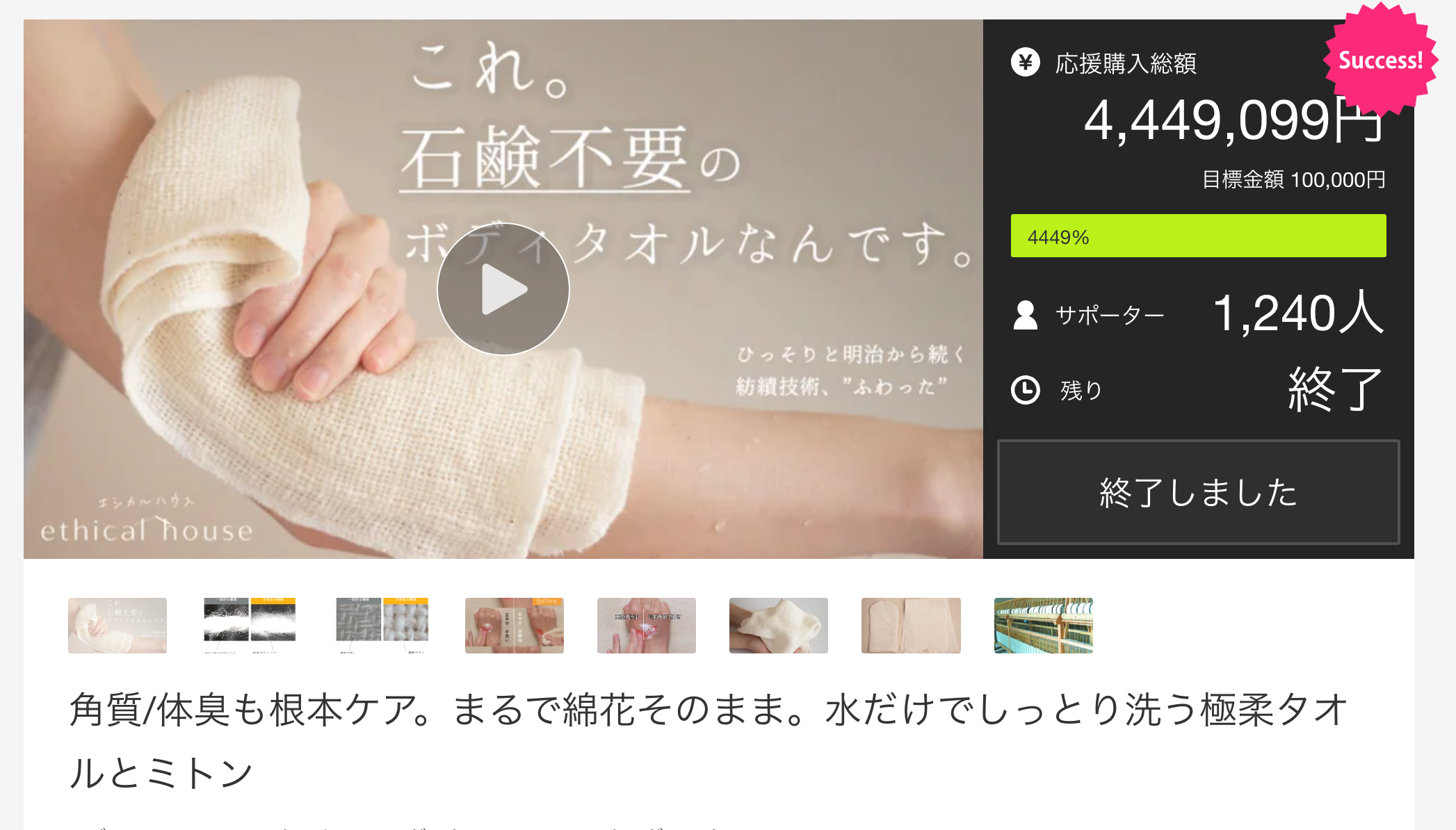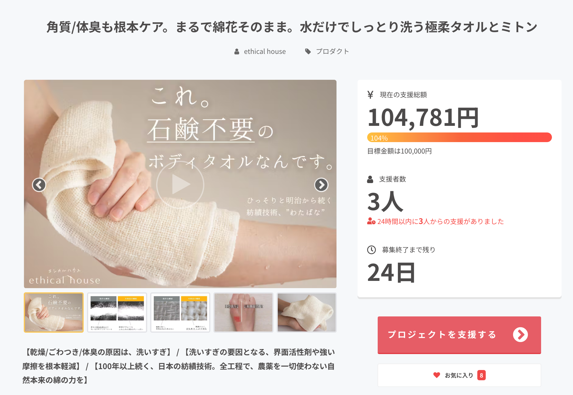 【応援者1,200人超えに続くプロジェクトが本日リリース】水だけで洗える、新感覚ボディウォッシュタオル