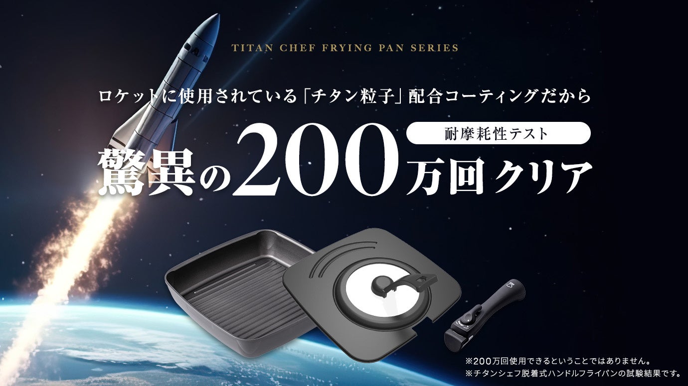 ロケットに使用されている「チタン粒子」配合したコーティングで、フライパンが焦げ付きにくく汚れもサッと落とすことができ、お手入れも簡単です。チタンコーティングは耐摩耗性に優れており「耐摩耗性テスト」で200万回をクリア。