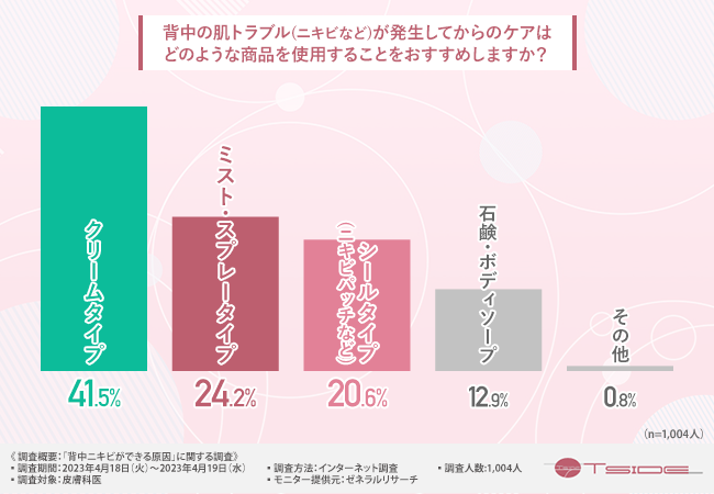 「背中の肌トラブル(ニキビなど)が発生してからのケアはどのような商品を使用することをおすすめしますか?」と質問したところ、『クリームタイプ(41.5%)』という回答が最も多く、次いで『ミスト・スプレータイプ(24.2%)』『シールタイプ(ニキビパッチなど)(20.6%)』『石鹸・ボディソープ(12.9%)』と続きました。