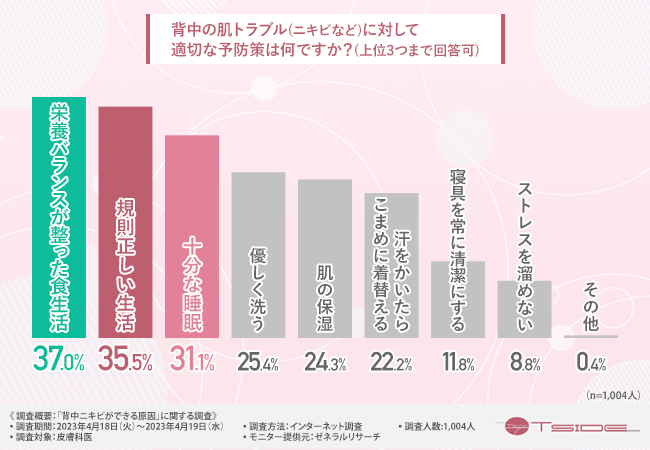 そこで、「背中の肌トラブル(ニキビなど)に対して適切な予防策は何ですか?(複数回答可)」と質問したところ、『栄養バランスが整った食生活(37.0%)』という回答が最も多く、次いで『規則正しい生活(35.5%)』『十分な睡眠(31.1%)』『優しく洗う(25.4%)』『肌の保湿(24.3%)』と続きました。