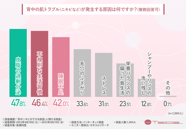 そこで今回、『アクロパス(背中ケアパッチ)』を販売する株式会社ティーサイド(http://t-side.net/)は、皮膚科医を対象に、「背中ニキビができる原因」に関する調査を実施しました。