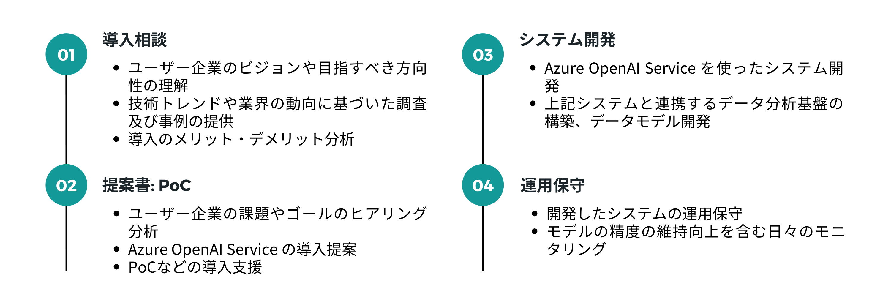 Azure OpenAI Service導入サービスは、お客様の業務効率化、生産性向上に向けて、Azure OpenAI Serviceの環境導入をサポートするサービスです。