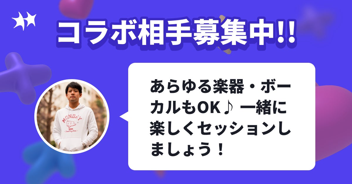 コラボが成立すると、あなたのSNS上でセッションの動画を公開することができます。首都圏近郊であれば、スタジオでのセッションや音楽イベント、ライブなどで実際に会ってセッションすることも可能です。これまでにない新たな動画制作に挑戦するため、個性豊かな音楽家からのコラボ依頼をお待ちしていますとのことです。