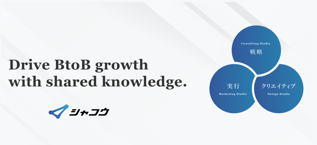 「Strategy Studio(戦略)」「Excution Studio(実行)」「Creative Studio(クリエイティブ)」の3つのスタジオからなるシャコウでは、上流戦略設計から下流の実務遂行・クリエイティブまで三位一体でグロース支援をいたします。「BtoBの暗黙知をなくし、知の共有でBtoB業界をアップデートする」をミッションにクライアント様の課題を解決いたします。