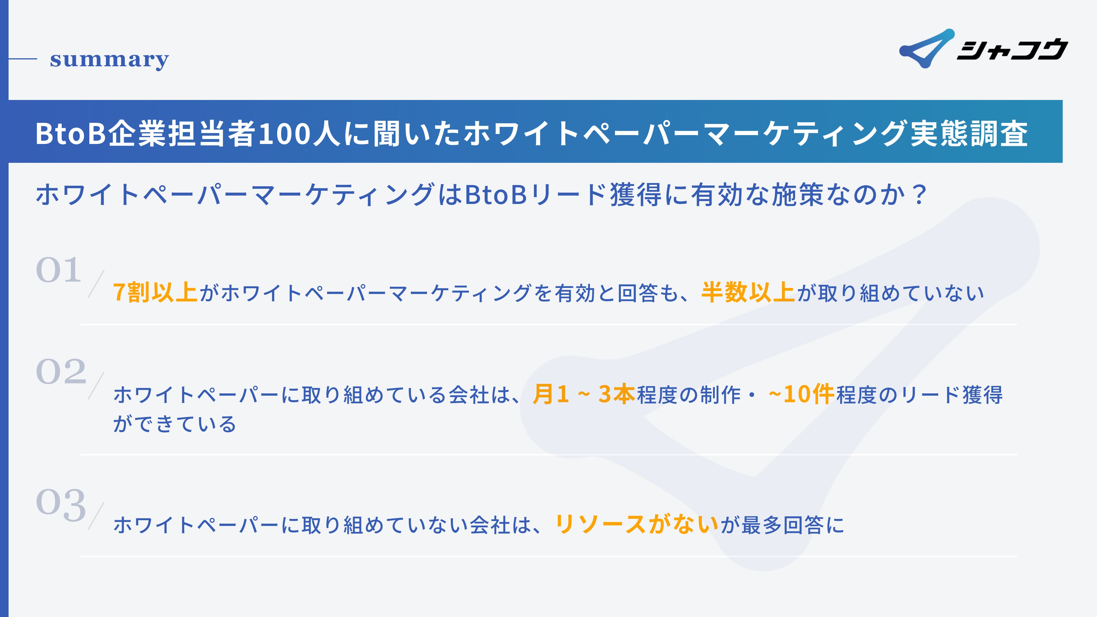 の質問項目より、ホワイトペーパー施策を実施できている企業は5割以下という結果となりました。