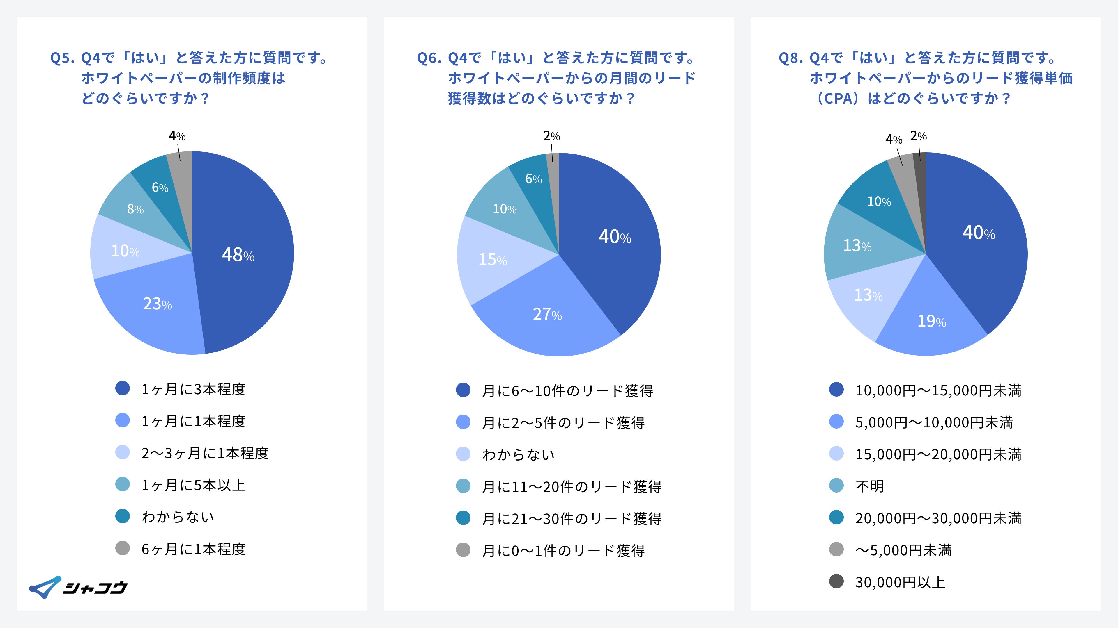 の質問項目より、ホワイトペーパー施策に取り組めている企業は、「月に1~3本程度のホワイトペーパーの制作」「リード獲得件数 ~ 10件程度」「獲得CPA 10000 ~ 15000円」が多いという結果となりました。
