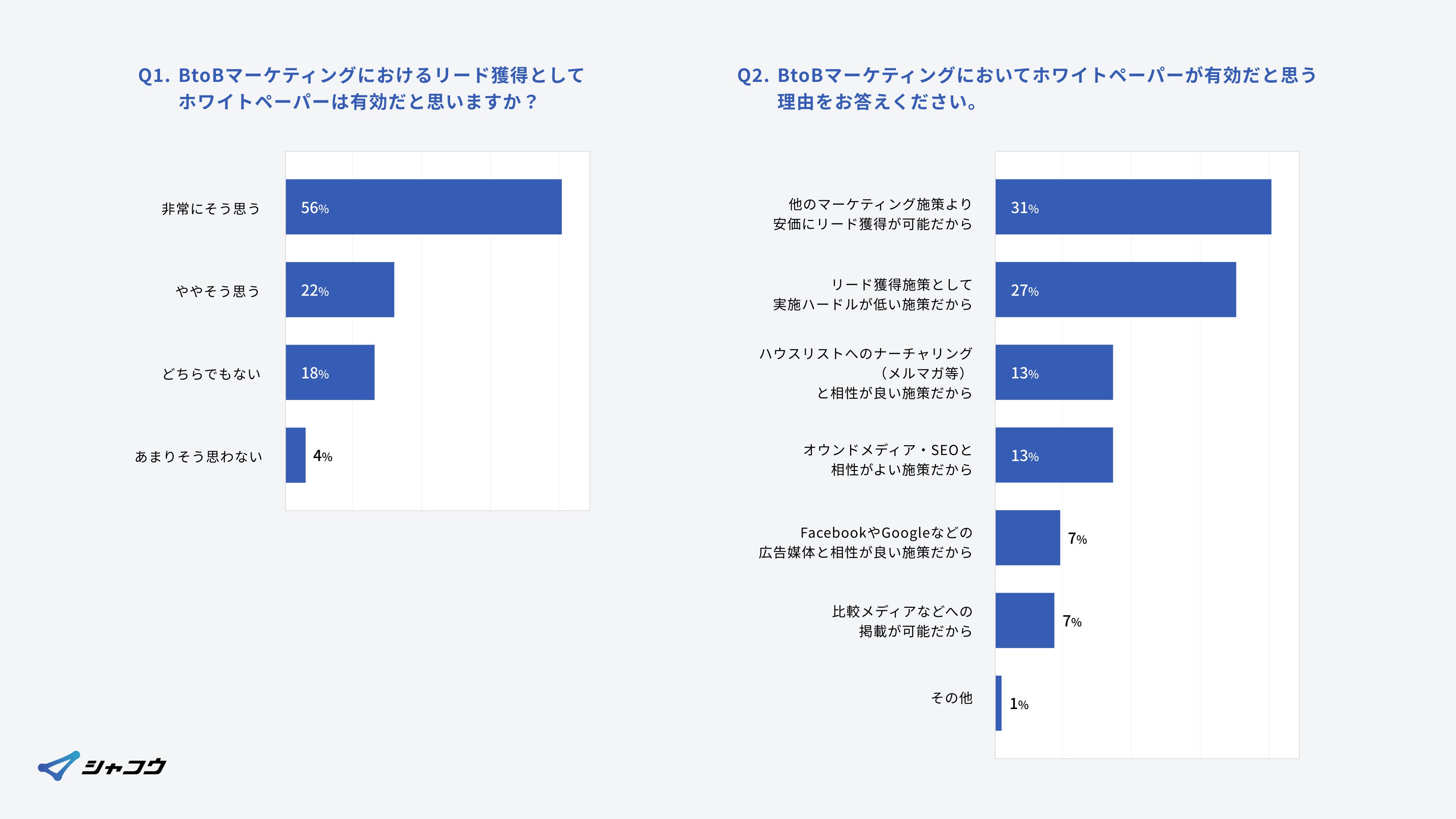 の質問項目より、7割以上がホワイトペーパーを有効な施策と認識しており、理由としては、「他のマーケティング施策より安価にリード獲得が可能だから」「リード獲得施策として実施ハードルが低い施策だから」という結果となりました。