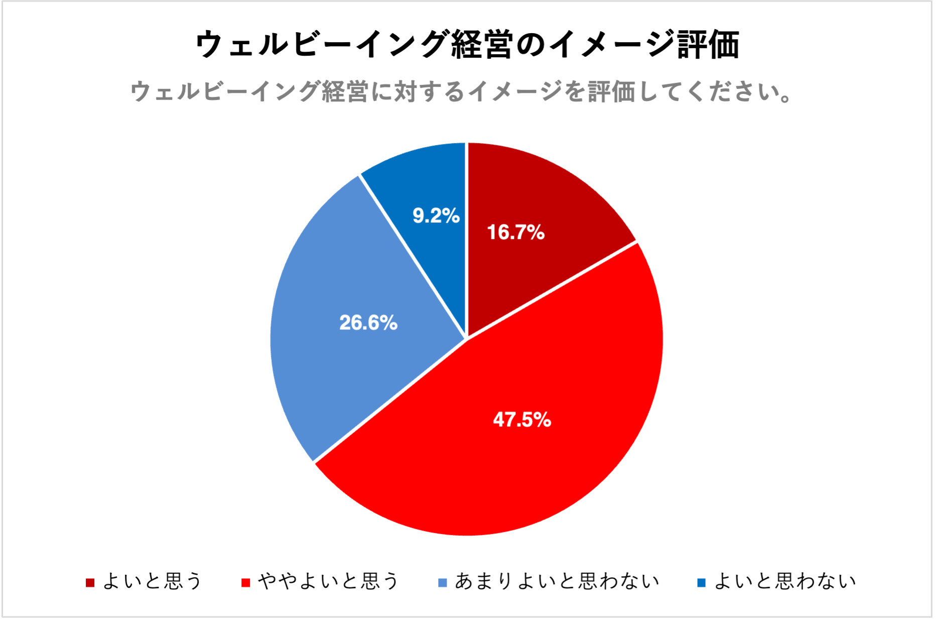 調査全体を通じて、健康経営よりも、ウェルビーイング経営が、その内容・施策・考え方いずれも、従業員からの支持される結果となった。その理由としては、時代の変化とともに、画一的な健康のあり方で管理するよりも、従業員個別の健康のあり方に寄り添い、身体と心の健康両面を対象とする「ウェルビーイング」が、求心力を増していると考えられる。