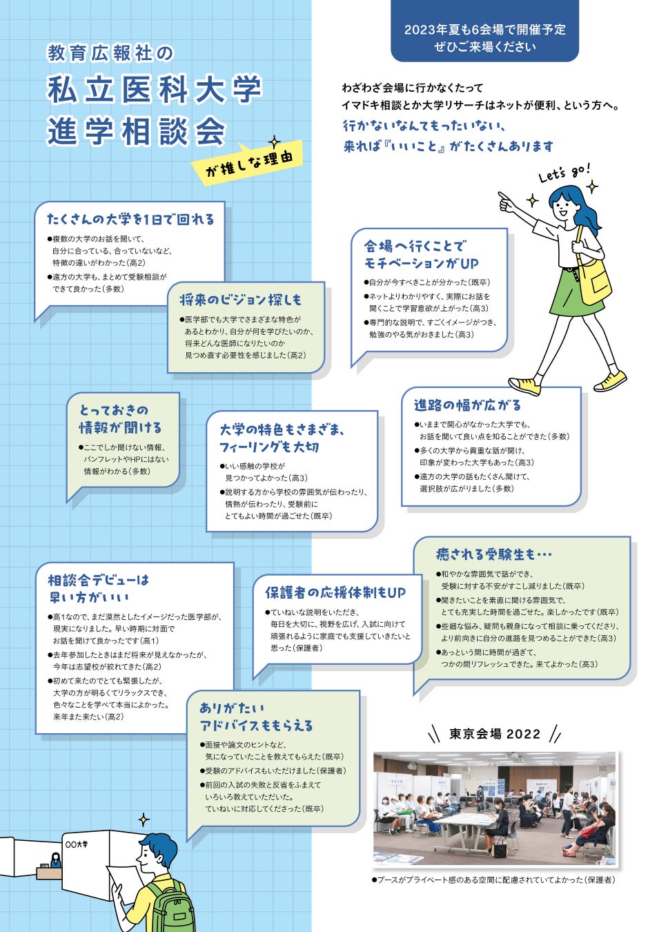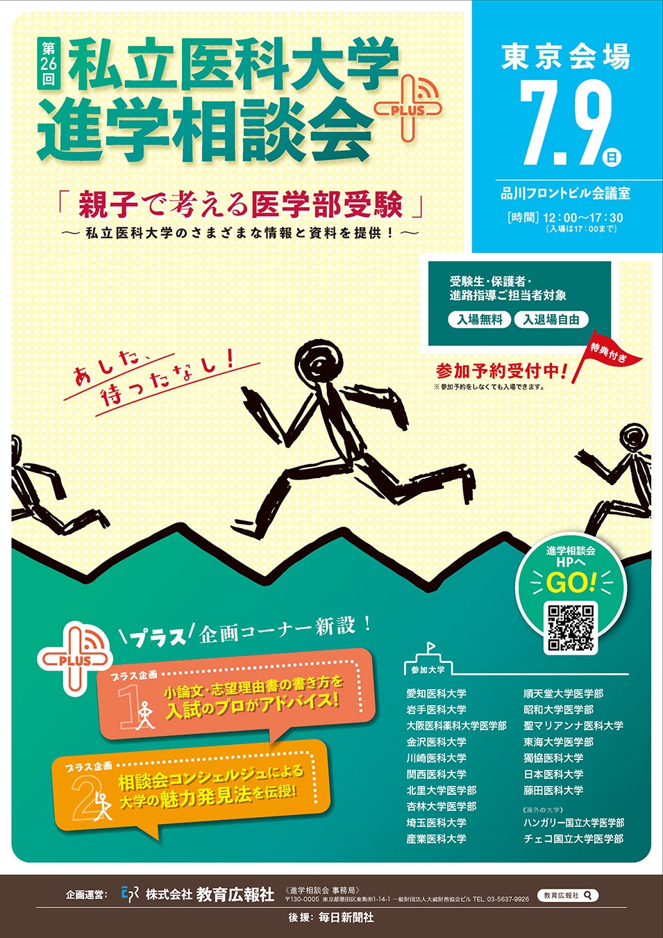 株式会社 教育広報社 主催の「私立医科大学進学相談会」は今年で26年目を迎え、「親子で考える医学部受験」をテーマに、新しい企画を提供します。来場者(受験生・保護者・進路指導担当者)は、希望の大学ブースを回り、大学担当者から説明を受けたり、各自が知りたい情報を自由に質問することができます。