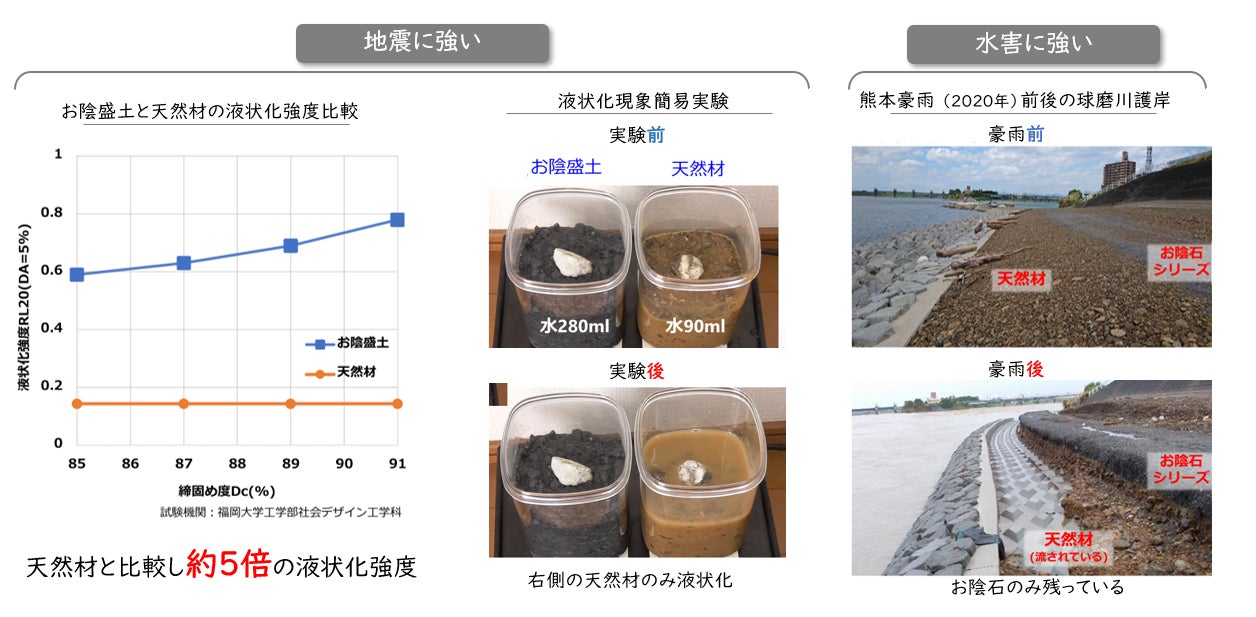 お陰石は天然材と比較して吸水性が高く、約5倍の液状化強度があり、地震や水害に強い資材です。
