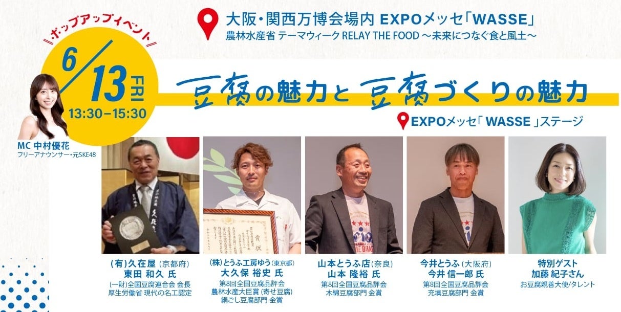一般社団法人日本豆腐マイスター協会(所在地:愛知県半田市/代表理事:磯貝剛成)は、一般財団法人全国豆腐連合会、関西とうふ連合会と共同で、2025年日本国際博覧会(大阪・関西万博)内の農振水産省が開催するイベントRELAY THE FOOD~未来につなぐ食と風土~に出展し2025年6月8日(日)〜6月15日(日)の期間、お豆腐をPRいたします。