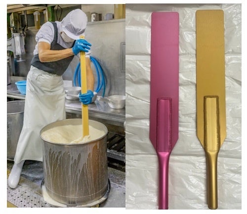 ・豆腐職人体験コーナー (豆乳を固める道具:ワンツー、金色・ピンクのカイ)