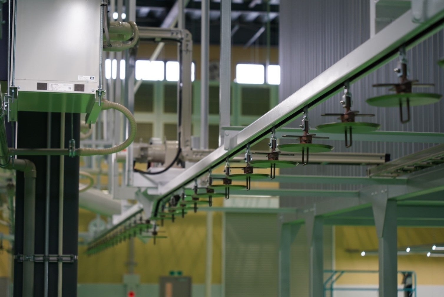 最新の吊り上げ自動化ラインで生産性大幅アップ。工場内の働きやすさにも配慮。
