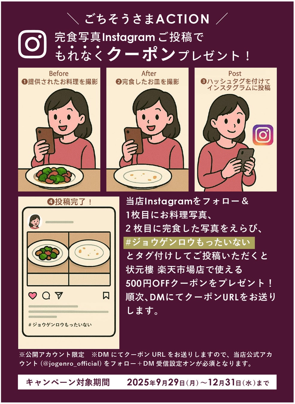 Instagramアカウントで1枚目にお料理、2枚目に完食写真を「#ジョウゲンロウもったいない」 を付けてInstagramに投稿いただいた方に、公式アカウントからDM(ダイレクトメッセージ)にてクーポンURLをお送りします!