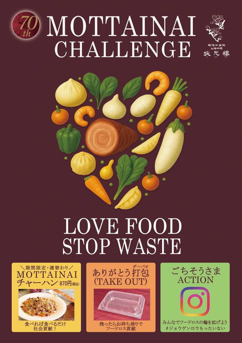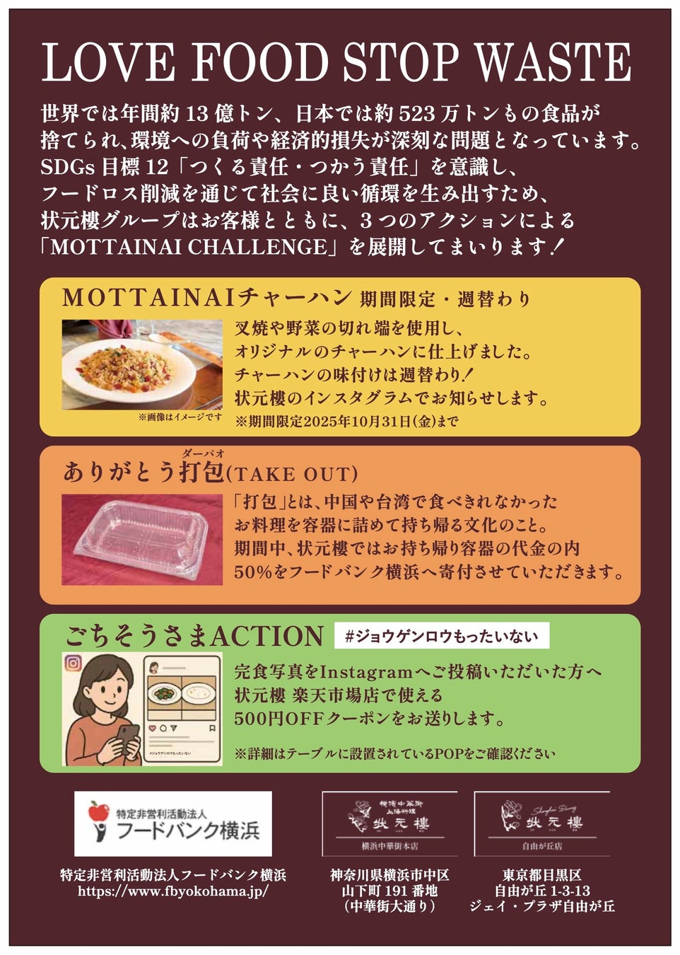 横浜中華街の老舗・状元樓(運営:株式会社ペガサスエンタープライズ、所在地:横浜市中区山下町191)では、SDGs目標12「つくる責任・つかう責任」を意識し、フードロス削減を通じて、社会に良い循環を生み出すため、2025年9月29日(月)~12月31日(水)の期間中、お客様とともに3つのアクションによる「MOTTAINAI CHALLENGE」を展開してまいります!