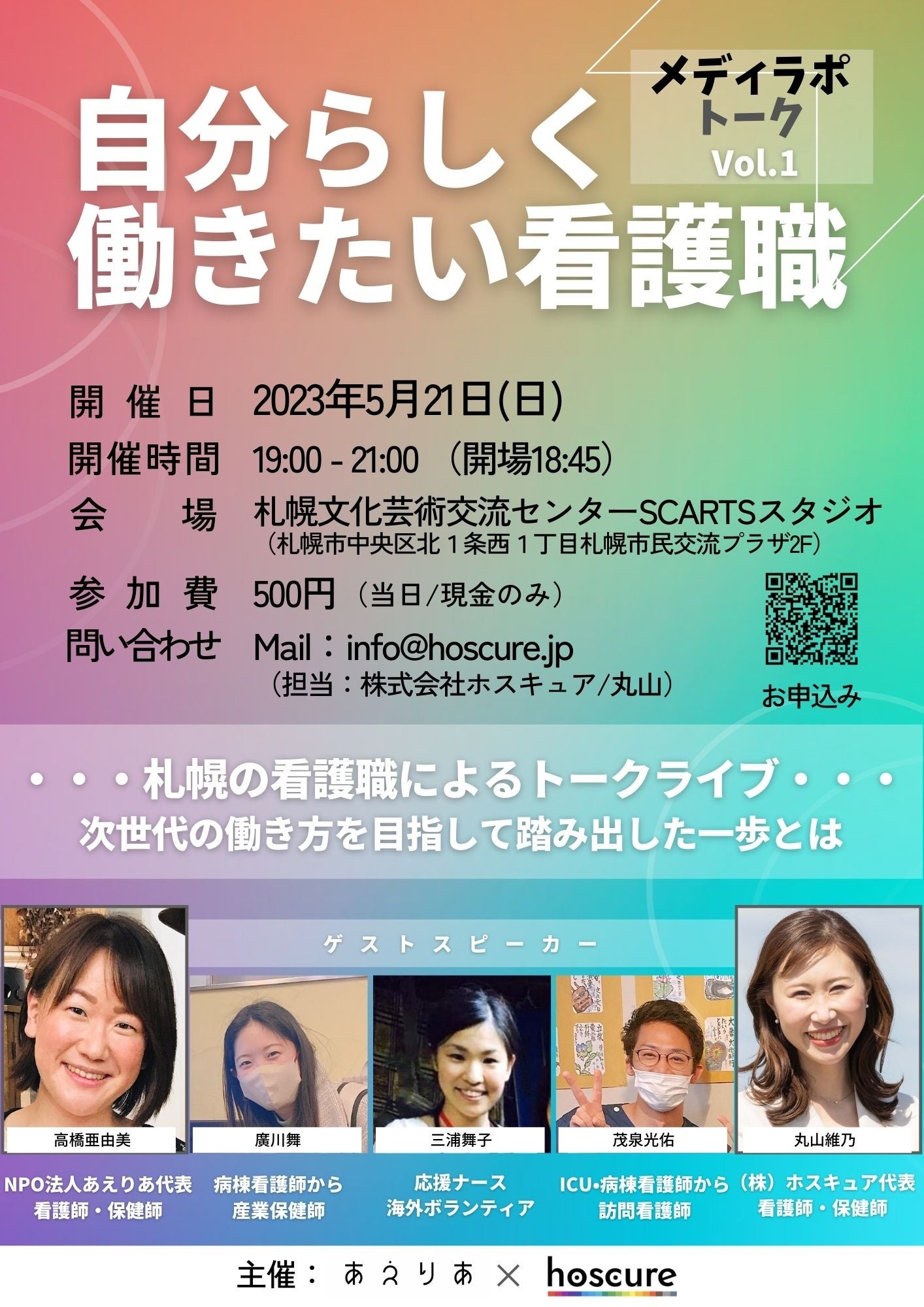 2023年5月21日(日)19:00〜21:00に、札幌文化芸術交流センターSCARTSスタジオにて開催したトークイベント『メディラポトークvol.1「自分らしく働きたい看護職」』を開催しました。
