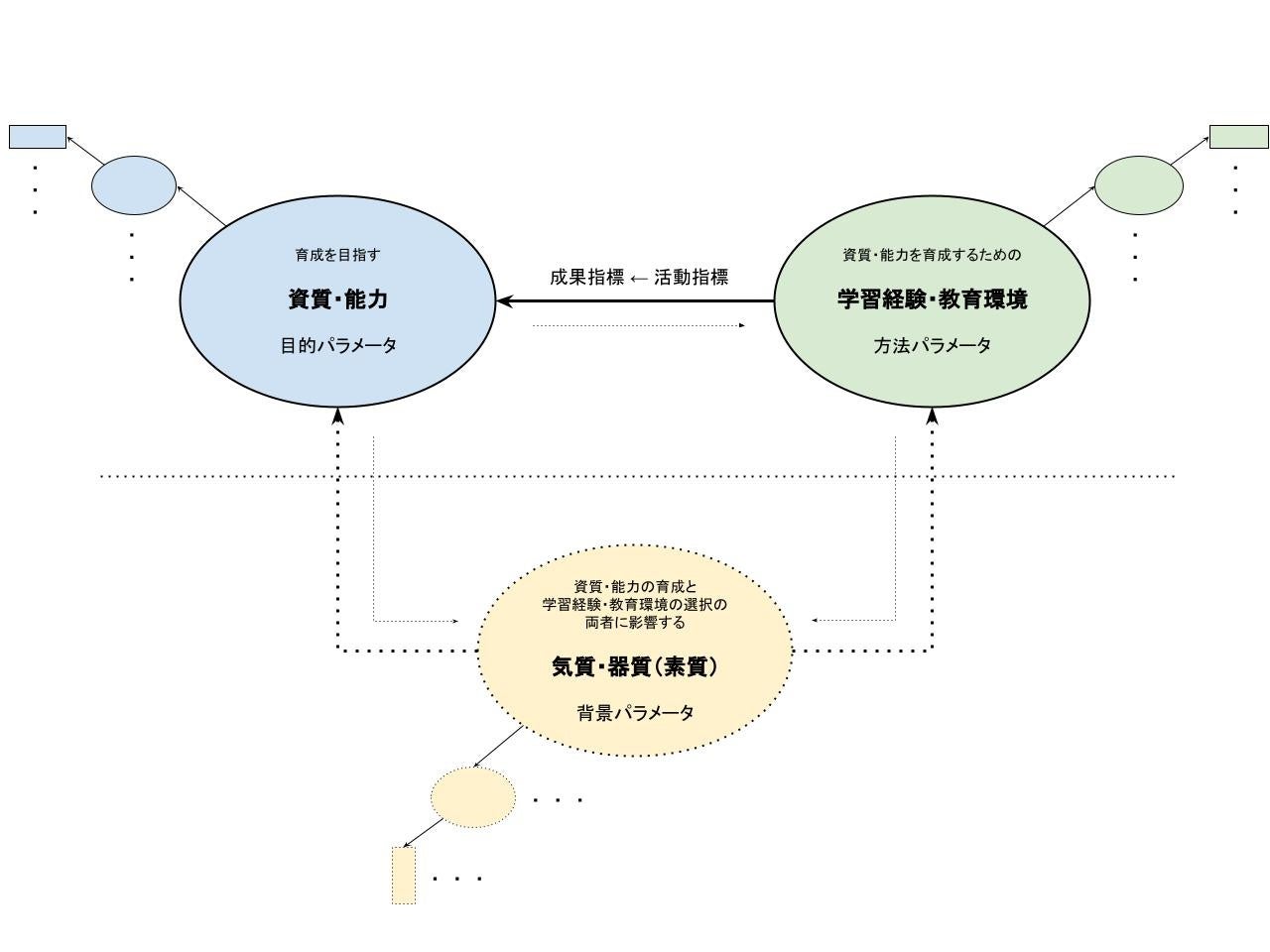 一般社団法人School Transformation Networking(ScTN)では、データの取得や連携、分析の基礎理論となるパラメータ体系として、(1)育成を目指す「資質・能力」、(2)(1)のために必要な「学習経験・教育環境」とともに、(3)(1)の育成や(2)の選択に影響する「気質・器質(素質)」を設定しています(下図)。