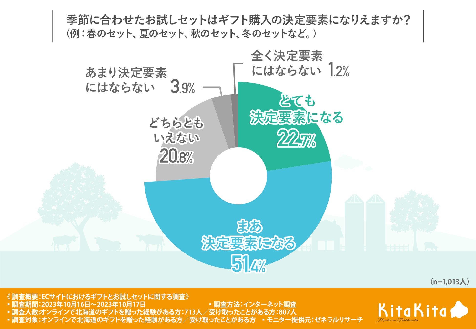 「季節に合わせたお試しセットはギフト購入の決定要素になりえますか?」と質問したところ、『まあ決定要素になる(51.4%)』『とても決定要素になる(22.7%)』とおよそ75%の方が季節に合わせたお試しセットはギフトとして魅力的だと感じていることがわかりました。