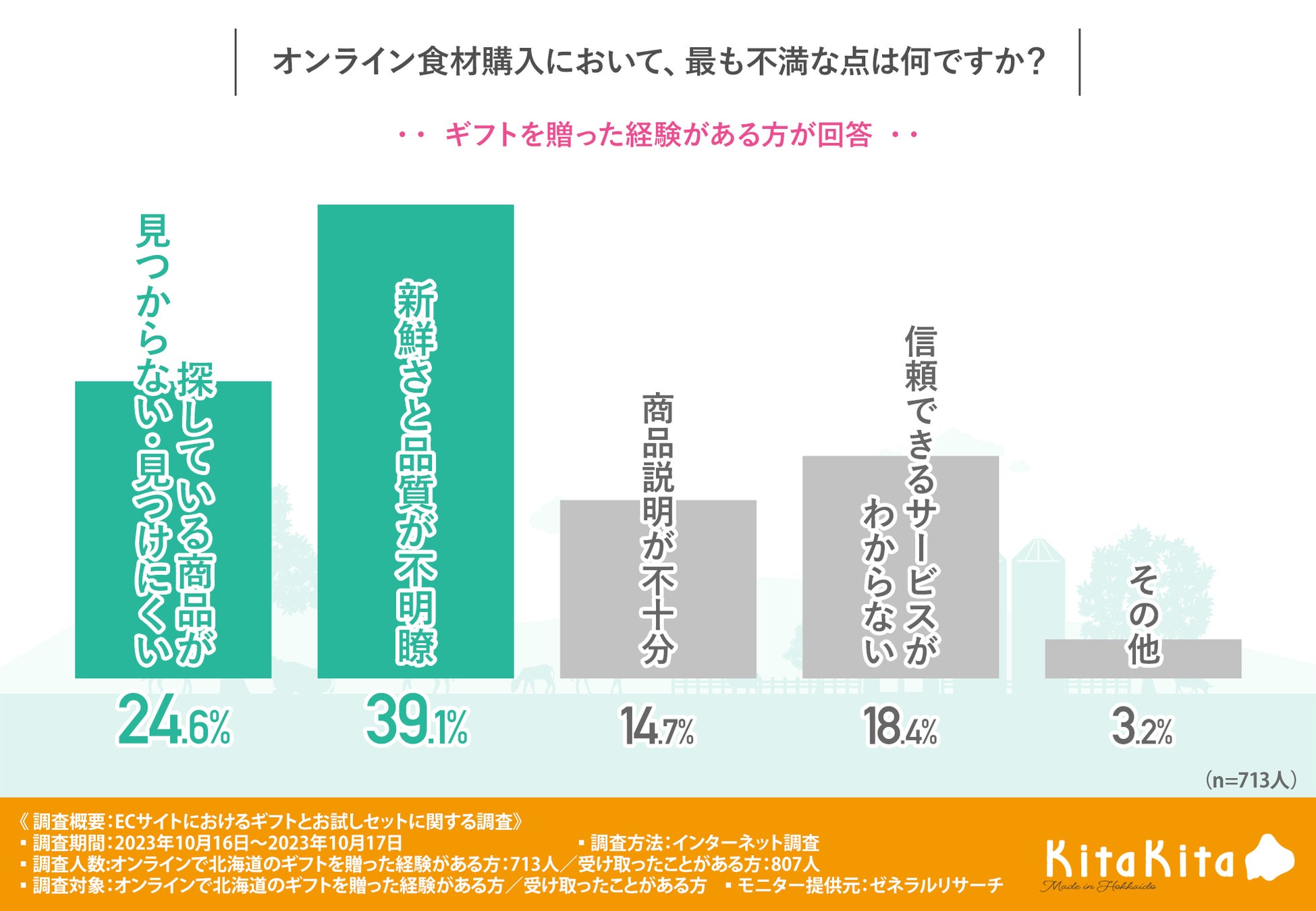 「オンライン食品購入において、最も不満な点は何ですか?」と質問したところ、『新鮮さと品質が不明瞭(39.1%)』と回答した方が最も多く、次いで『探している商品が見つからない・見つけにくい(24.6%)』『信頼できるサービスがわからない(18.4%)』『商品説明が不十分(14.7%)』と続きました。